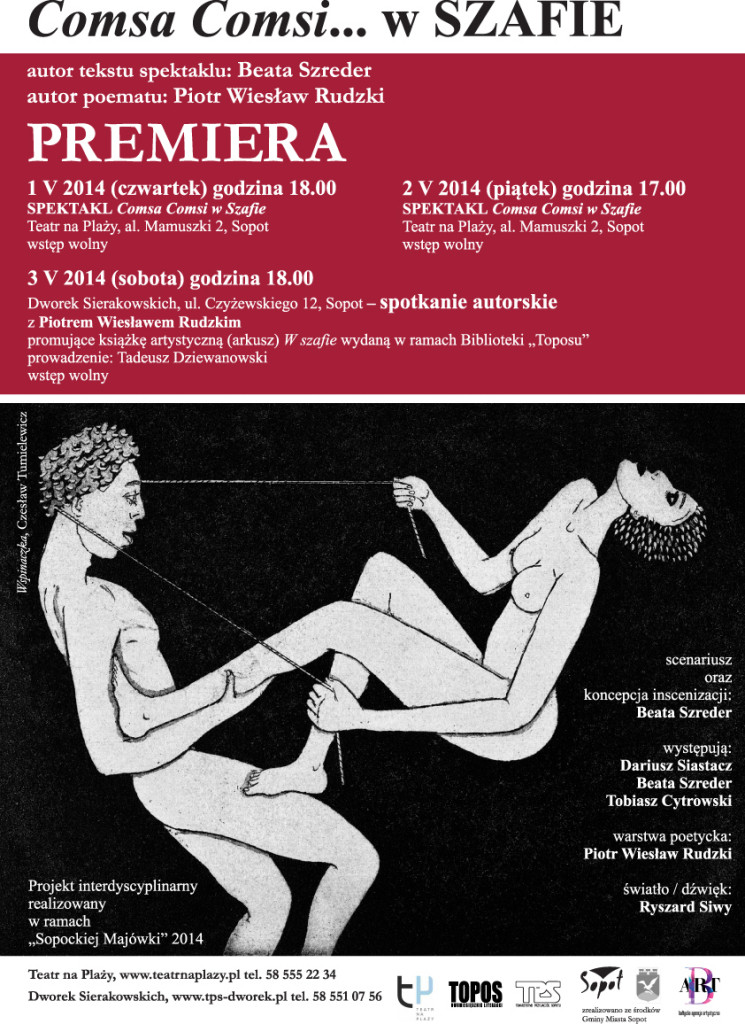 Teatr na Plaży zaprasza w ramach imprezy „Sopocka Majówka 2014″ na premierę spektaklu „Comsa Comsi …w SZAFIE” czyli mariaż trzech sztuk: teatru, poezji oraz kina.