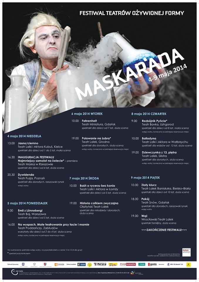 Festiwal Teatrów Ożywionej Formy MASKARADA organizowany od pięciu lat przez Teatr Maska w Rzeszowie to przegląd najciekawszych realizacji teatru formy z ostatnich sezonów. Program festiwalu to zarówno spektakle salowe, jak i plenerowe, dla dzieci i dla dorosłych. Jest również specjalne pasmo dla najnajów, czyli najmłodszych widzów od 1 roku życia.
