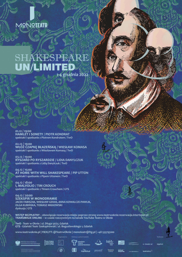 Fenomen. Ikona. Czterystuletni inspirator, wszechstronny twórca, autor neologizmów, motor dialogu międzykulturowego oraz stymulator ponadczasowej refleksji. Odszedł 406 lat temu, zostawiając twórczość uniwersalną, rodzącą niezliczone ścieżki interpretacyjne i korespondującą z rzeczywistością we wszystkich czasach i zakątkach globu. Projekt służy naświetleniu recepcji twórczości Williama Szekspira oraz inspiracji postacią Stratfordczyka w europejskim teatrze jednego aktora. „Shakespeare un/limited” – nawiązujący do nielimitowanej dostępności prezentowanych dzieł, to również „Shakespeare limited” – grany każdorazowo przez jednego aktora, który na scenie skonfrontuje się z publicznością. Projekt będzie miał charakter hybrydowy, łącząc formę tradycyjną z działaniami na płaszczyźnie wirtualnej. Jego cechą charakterystyczną będzie ogólnodostępność oraz dedykowane działania edukacyjne – współpraca z liceami ogólnokształcącymi w całym kraju, do których skierujemy bezpłatną ofertę edukacyjną bazującą na realizowanych działaniach. Będzie to ósma edycja cyklu MONOTEATR, rozwijanego przez Teatr w Oknie od 2016 roku. Pragniemy ją zadedykować przedwcześnie zmarłemu w marcu 2021 roku śp. Profesorowi Jerzemu Limonowi – wielkiemu szekspirologowi i mentorowi, będącemu naszą nieskończoną inspiracją.
