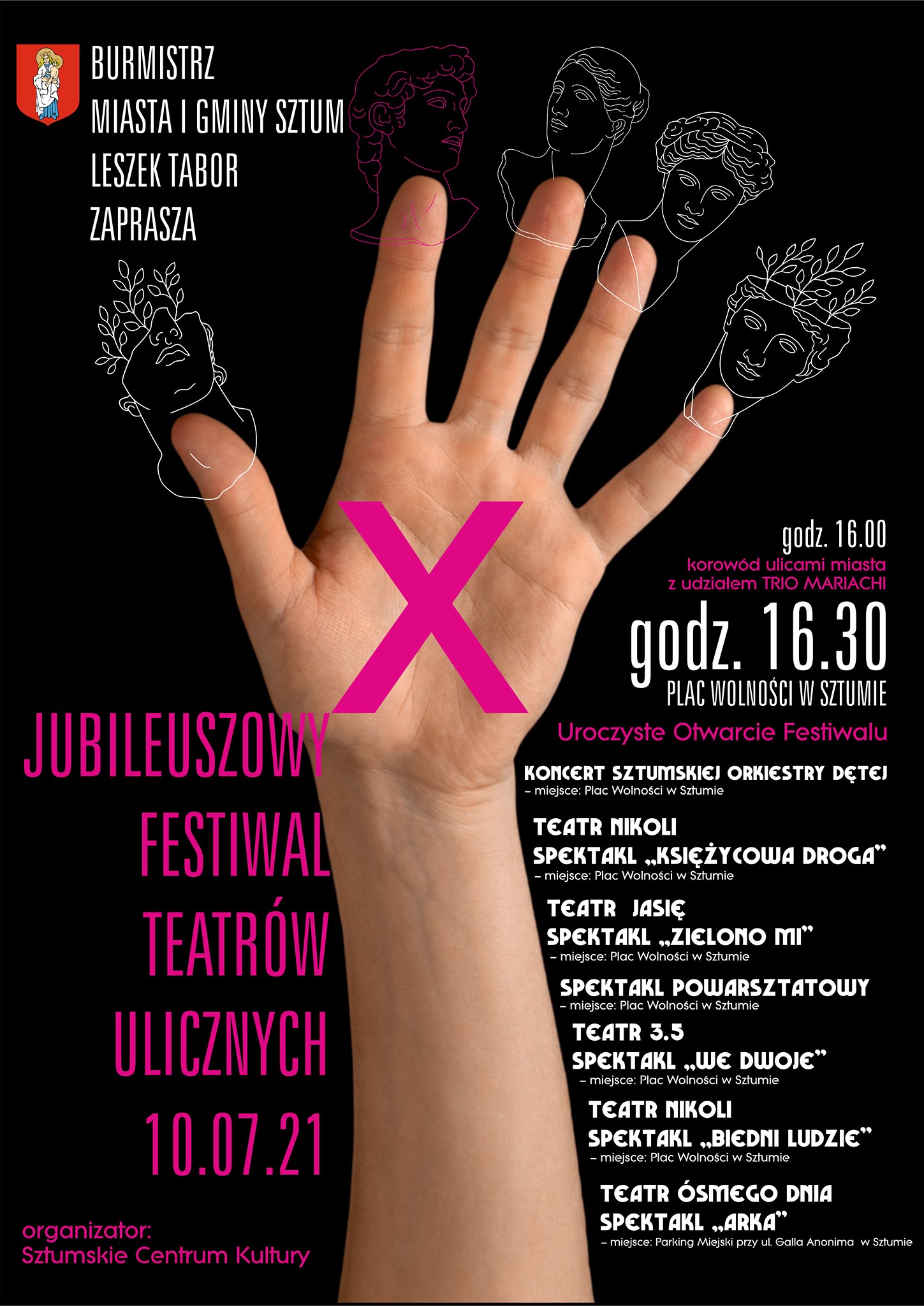 Po tym koncercie prezentacje poszczególnych zespołów teatralnych. Wystąpią w Sztumie kolejno: Teatr Nikoli ze spektaklem „Księżycowa droga”Teatr Jasię z widowiskiem „Zielono mi”, potem widzowie obejrzą spektakl powarsztatowy, następnie Teatr 3.5 pokaże spektakl „We dwoje”Teatr Nikoli widowisko „Biedni ludzie”, na koniec Teatr Ósmego Dnia pokaże spektakl „Arka”. Uwaga – wszystkie widowiska oprócz ostatniego zostaną wystawione na placu Wolności, Teatr Ósmego Dnia wystąpi na parkingu miejskim przy ul. Galla Anonima, czyli bardzo blisko placu Wolności.