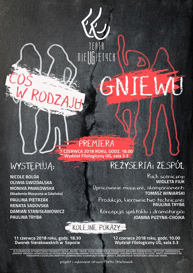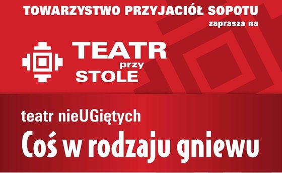 W ramach cyklu Teatr przy Stole zapraszamy na spektakl przygotowany przez młodych teatrologów z Uniwersytetu Gdańskiego działających pod szyldem teatr nieUGiętych. Pod kierunkiem dr Joanny Puzyny-Chojki zaprezentowane zostanie przedstawienie „Coś w rodzaju gniewu”. Spektakl ten zrodził się z doświadczenia frustracji jako podstawowego sposobu przeżywania świata, złączonego z potrzebą przywrócenia uczuć buntu i niezgody na zakłamanie. Ich brak – szczególnie dotkliwy w młodym pokoleniu – zmienia nasze społeczeństwo dobrobytu w bezideową, manipulowaną przez polityków i media „wspólnotę konsumentów”. W scenariuszu przedstawienia wykorzystano fragmenty sztuk „Miłość i gniew” Johna Osborne’a (w przekładzie Wacławy Komarnickiej i Krystyny Tarnowskiej), „Masara” Mariusa Ivaškevičiusa (w przekładzie Agnieszki Lubomiry Piotrowskiej), reportażu „Zakonnice odchodzą po cichu” Marty Abramowicz (w transkrypcji scenicznej Martyny Lechman) oraz scenariuszy filmów „Idioci” i „Melancholia” w reżyserii Larsa von Triera.