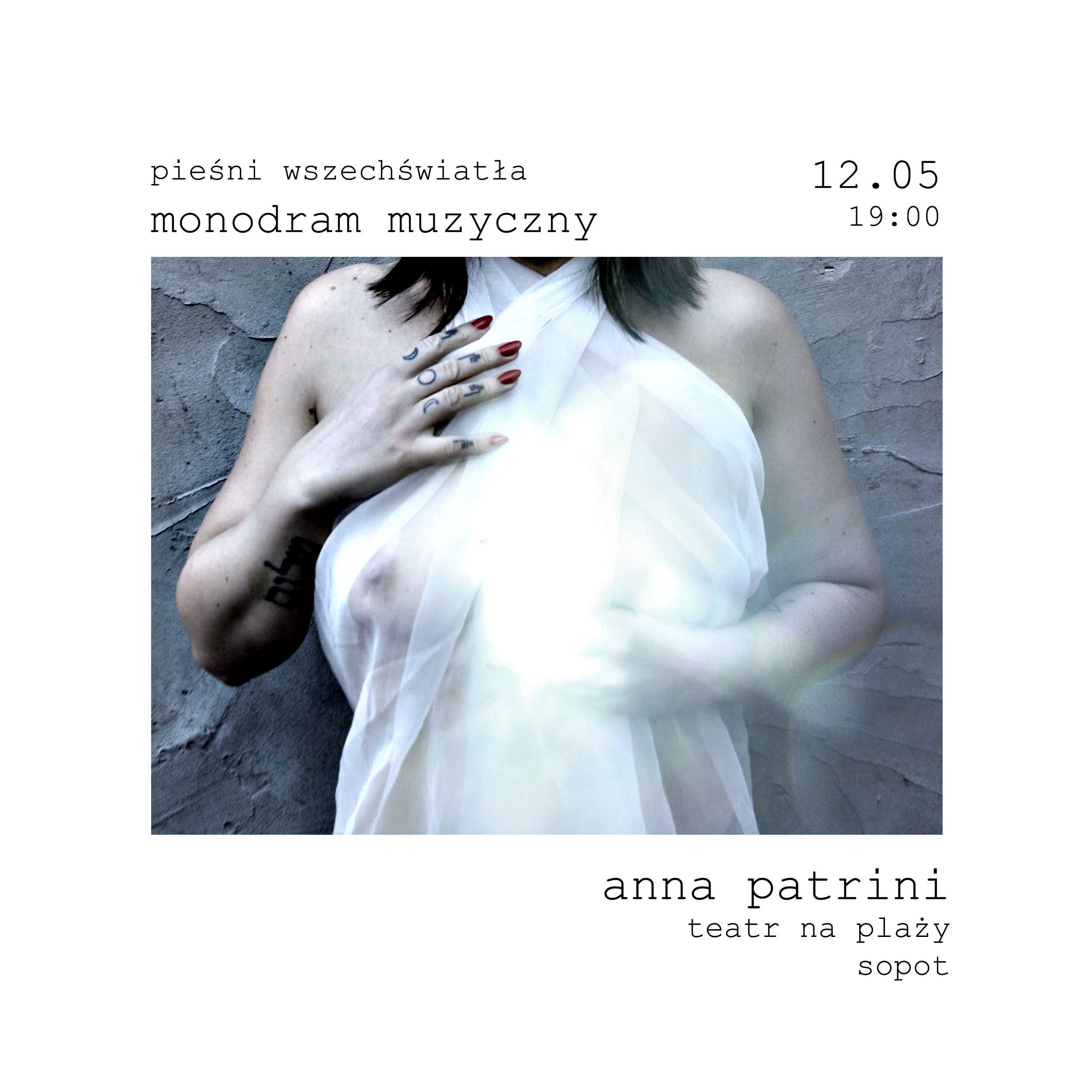 ANNA PATRINI – artystka interdyscyplinarna, tworząca głównie w takich dziedzinach jak: muzyka, poezja, fotografia, kostiumografia, zajmująca się przy tym szeroko pojętym rozwojem duchowym. Absolwentka Sopockiej Szkoły Fotografii, jednocześnie adeptka Reiki oraz uczennica tybetańskich mistrzów medytacji. Wokalistka, autorka tekstów, aranżacji muzycznych oraz wizualizacji duetu Skinny Patrini, który współtworzyła w latach 2005-2012, koncertując w całej Europie oraz reprezentując polską scenę klubową na EXPO w Szanghaju w 2010 roku. Nagrania z jej udziałem znalazły się na ścieżkach dźwiękowych popularnych polskich filmów fabularnych, takich jak „Galerianki”, „Bejbi Blues”, a także „Lokator” produkcji francuskiej, dzięki czemu jej głos pobrzmiewał w salach kinowych na całym świecie, podczas prezentacji wyż.wym. filmów na festiwalach filmowych m.in. w Berlinie, Toronto i Cannes. Obok twórczości artystycznej zajmuje się terapią dźwiękiem, stosując w swej pracy mantry i misy tybetańskie, współpracuje ze szkołami jogi w kraju i za granicą. Miłośniczka sztuki i przyrody, wielbicielka podróży i poznawania świata, badanie tego, co nieznane.