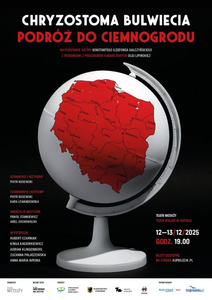 W poetycko-kabaretowym świecie, gdzie ironia spotyka się z absurdem, a śmiech idzie w parze z refleksją, łączą się dwie wyjątkowe tradycje polskiej satyry – błyskotliwa, pełna przewrotnego humoru twórczość Konstantego Ildefonsa Gałczyńskiego oraz inteligentny, kąśliwy i charakterystyczny styl Olgi Lipińskiej. Z ich inspiracji powstał spektakl „Chryzostoma Bulwiecia podróż do Ciemnogrodu” – gorzka komedia, która przygląda się społecznym przywarom.