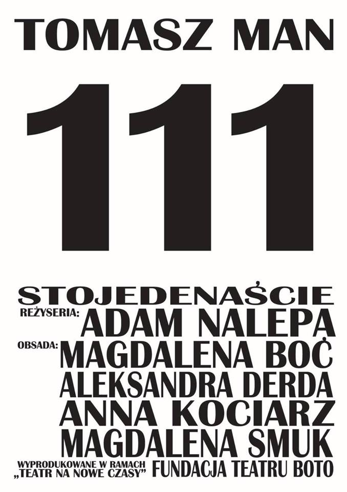 Fundacja Teatru BOTO oraz Fundacja Pomysłodalnia zapraszają na pokaz spektaklu pt. „111” Tomasza Mana, w reżyserii Adama Nalepy oraz warsztaty aktorskie z Aleksandrą Derdą.
