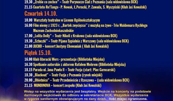 Przedstawienia teatralne, spektakle uliczne, parada ulicami miasta, ciekawe koncerty, prezentacje filmowe, spotkania i warsztaty artystyczne.