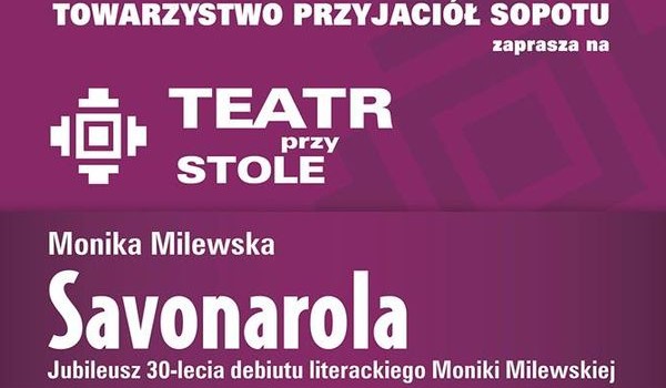 Towarzystwo Przyjaciół Sopotu serdecznie zaprasza performatywne czytanie dramatu „Savonarola” z okazji jubileuszu 30-lecia debiutu literackiego Moniki Milewskiej.