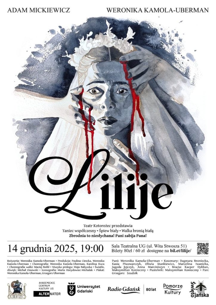 „Lilije” na podstawie wiersza Adama Mickiewicza to spektakl łączący teatr ruchu i tańca z teatrem dramatycznym, który dopełniają tradycyjny śpiew, gra na altówce i walka bronią białą. To spektakl epicki, mroczny, w bardzo wizualny i ruchowy sposób opowiadający historię Pani, która została ukarana za zbrodnię…, ale czy to ona dokonała tej zbrodni? Czy może przemoc w związku popchnęła ją do radykalnych rozwiązań, przez co teraz nie może spać po nocach, dręczona koszmarami, których personifikacje szarpią ją za włosy, za ubranie, na każdym kroku przypominając o krwi, którą ma na rękach? To opowieść o kobiecie, której losem i decyzjami kierują mężczyźni, doprowadzając do nieuniknionej katastrofy.