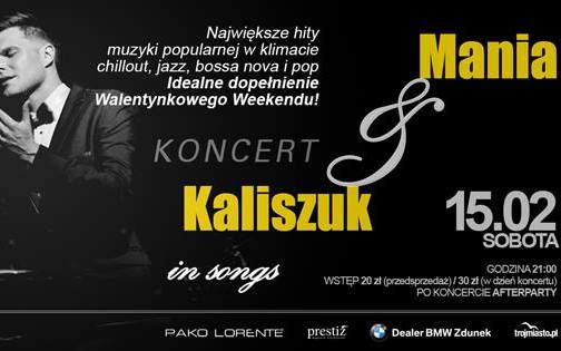 Marek Kaliszuk oraz Piotr Mania – dwaj znakomici trójmiejscy artyści – połączyli swoje doświadczenie, aby stworzyć muzyczny projekt Kaliszuk & Mania in Songs. Powstał wysmakowany duet: ciepły, aksamitny, głos Marka idealnie komponuje się z finezyjnym brzmieniem fortepianu Piotra. Nadając wielkim przebojom nową, ambitną, szlachetną formę i brzmienie, muzycy dają im nowe życie. Największe hity m.in. Rihanny, Kylie Minogue, Elvisa Presleya, Modjo, czy Modern Talking w zupełnie nowych aranżacjach, korespondują w estetyce chillout’u ze standardami Nat King Cole’a, czy Bogusława Meca. Zagrają: Marek Kaliszuk – wokal, Piotr Mania – piano, Grzegorz Lewandowski – perkusja, Marcin Bożek – bas.