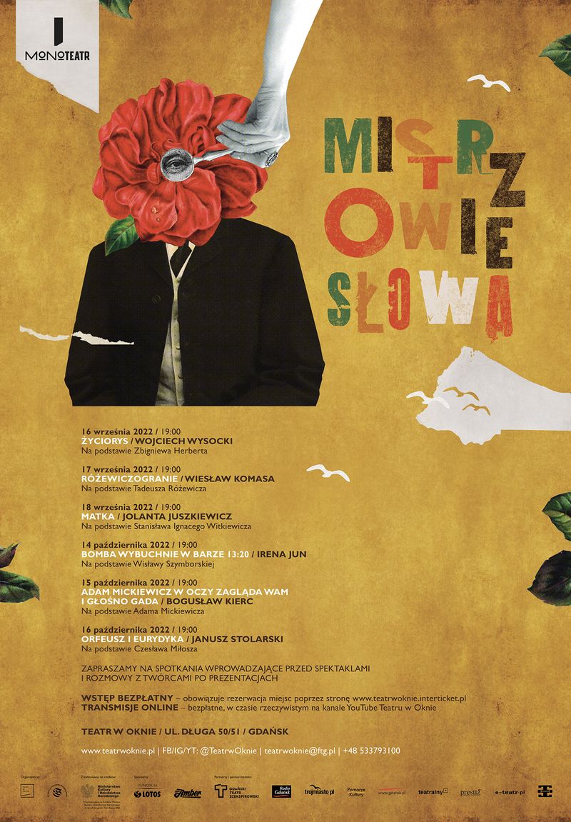 Projektem „MONOTEATR: Mistrzowie słowa” oddajemy hołd największym nazwiskom rodzimej literatury poprzez prezentację doskonałych wypowiedzi artystycznych w dziedzinie teatru jednego aktora, które czerpią z twórczości literackich ikon. Czekają nas emocjonujące spotkania ze słowem Herberta, Mickiewicza, Miłosza, Różewicza, Szymborskiej i Witkacego. Słowo żywe to słowo czytane, dyskutowane, korespondujące, rodzące w tym – często przypadkowym – dialogu nowe konteksty i jakości. A literatura żyje dopóty, dopóki się o niej – i nią – mówi. Ta idea przyświeca całemu cyklowi. „Mistrzowie słowa” to jednak nie tylko literaccy giganci – to również teatralne autorytety, twórcy najdłużej goszczący na jednoosobowej scenie, wyznaczający horyzonty i dający pokaz swej maestrii od dziesięcioleci. W Teatrze w Oknie zagoszczą tej jesieni prawdziwe sławy polskiego monodramu!