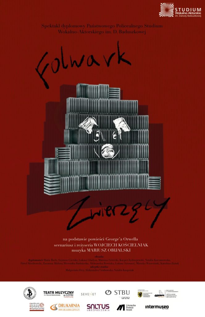 „Folwark zwierzęcy” Georga Orwella jest metaforyczną opowieścią o gospodarstwie, w którym ciemiężone przez ludzi zwierzęta podejmują wysiłek rewolucji po to, żeby znieść ich władzę. Kiedy się to udaje, zachłyśnięte wolnością przemianowują Folwark dworski na Folwark zwierzęcy, a najinteligentniejsze świnie – w sposób demokratyczny, oczywisty i z aprobatą ogółu – przejmują rządy nad gromadą. Z czasem, krok po kroku, narzucają coraz bardziej dolegliwe ograniczenia w funkcjonowaniu społeczności. Mijają dni, miesiące i lata a obiecany dobrobyt nie nadchodzi. Po jakimś czasie świnie upodabniają się do ludzi i sytuacja wraca do początkowej, zatacza pełne koło. Świnie terroryzują i uciskają pozostałe zwierzęta, wynoszą się ponad prawo i przejmują wszystkie złe cechy, które wcześniej należały do ludzi i z powodu których nastąpiła rewolucja. Folwark zwierzęcy jest powieścią w dalszym ciągu aktualną. W skuteczny, skrótowy i obrazowy sposób opowiada o tym, jak z bycia ofiarą stajemy się oprawcami, jak władza korumpuje i deprawuje. Świat, który przedstawia Orwell jest tworzywem, które nadaje się do przedstawienia w formie musicalowej. W moim przekonaniu piosenki są wręcz wpisane w ten materiał. Przecież pierwowzór literacki aż skrzy się od pieśni rewolucyjnych i bojowych. Czytając „Folwark zwierzęcy” co rusz można się natknąć na sceny, które wręcz prowokują, by przerobić je na piosenki: wielkie bitwy, pijaństwo świń, wspólna praca, marzenia, obawy… Jeśli spróbujemy do tego dopisać jeszcze indywidualne myśli bohaterów zamienione w piosenki, to wydaje się, że szansa na powstanie ciekawego musicalu jest realna. Folwark zwierzęcy to zapis wielu postaw, wobec zmieniającej się rzeczywistości. Rygor rewolucyjnych zmian inaczej przyjmują świnie, inaczej konie, jeszcze inaczej owce, osioł, kocica czy koza. Trzymajcie kciuki, bo zapowiada się ciekawa przygoda, której, Ty, Widzu – mamy nadzieję – staniesz się częścią”.