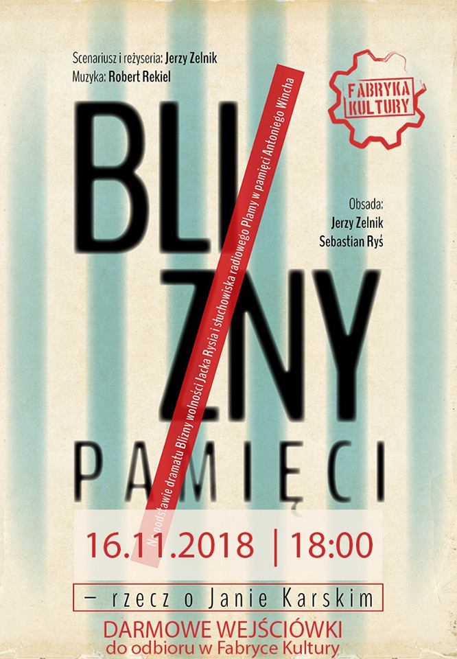 We współpracy z Fundacją Zatrzymać Czas Fabryka Kultury zaprasza na przedstawienie „Blizny pamięci – rzecz o Janie Karskim”