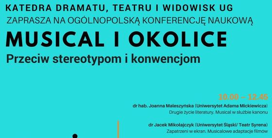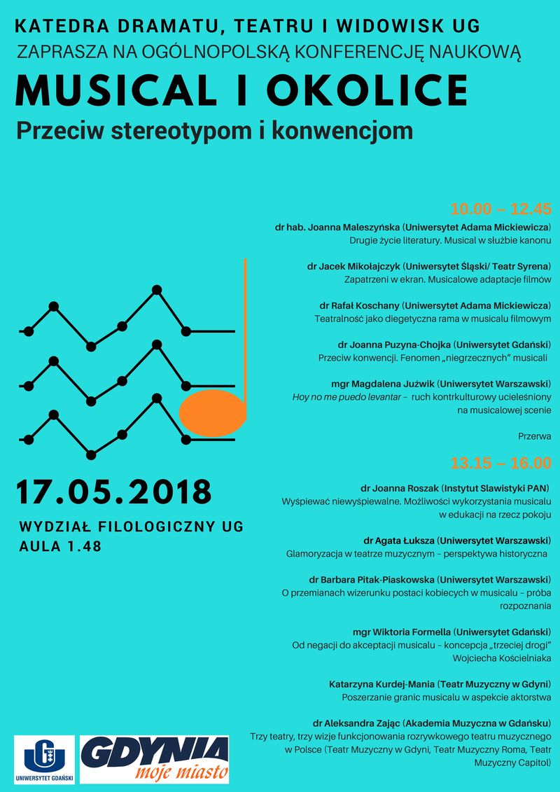 W czasie naszej kameralnej konferencji chcielibyśmy podjąć na nowo próbę z(re)definiowania musicalu w odpowiedzi na rozmaite akty transgresji gatunkowej, podyktowane nade wszystko zmianą ideologii dramatyczności (stymulowaną między innymi przez wszechobecność nowych mediów). A także pokazać szerokie pole, na którym musical realizuje się w praktyce scenicznej, skupiając się przede wszystkim na interpretacji najbardziej wartościowych i ważkich spektakli, zbuntowanych często przeciw przypisywanym tej formie teatru stereotypom i konwencjom.