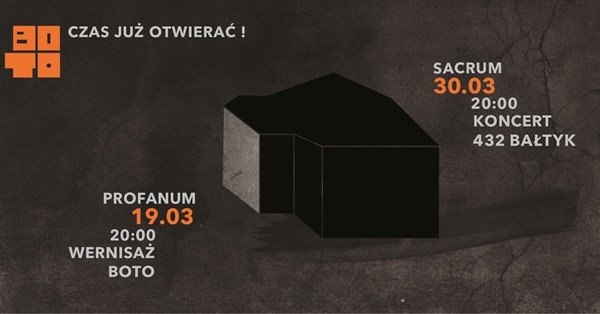 Oficjalne otwarcie sali teatralno-koncertowej („sacrum”) ma miejsce w środę, 30 marca o godz. 20:00. Działalność artystyczną BOTO zainicjuje koncert zapowiadający eksperyment muzyczny 432 BAŁTYK. Jego ideą jest tworzenie muzyki improwizowanej, której filarem stanie się przesyłany w czasie rzeczywistym dźwięk emitowany przez Morze Bałtyckie. Tomasz Urbański, twórca projektu, zaprosił do grania uznanych polskich artystów, jednak będzie to także przestrzeń do interaktywnego udziału publiczności. Zastosowanie strojenia w częstotliwości 432 Hz, jak i pominięcie technologii cyfrowej, daje niespodziewany efekt znacznego pogłębienia odbioru i spotęgowania emocji słuchacza.