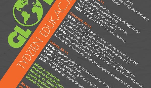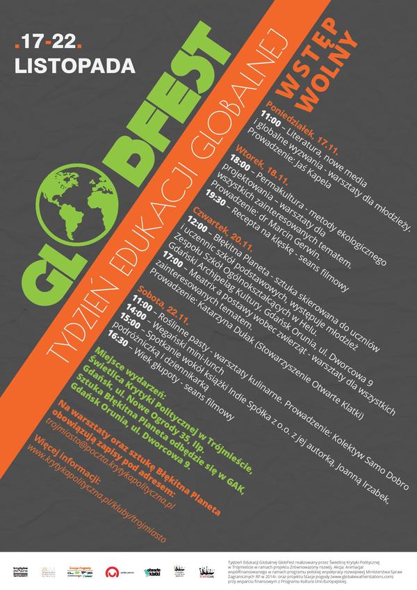 Tydzień Edukacji Globalnej GlobFest realizowany przez Świetlicę Krytyki Politycznej w Trójmieście w ramach projektu Zrównoważony rozwój. Akcja: Animacja!współfinansowanego w ramach programu polskiej współpracy rozwojowej Ministerstwa Spraw Zagranicznych RP w 2014r. oraz projektu Stacje pogody(www.globalweatherstations.com) przy wsparciu finansowym z Programu Kultura Unii Europejskiej.