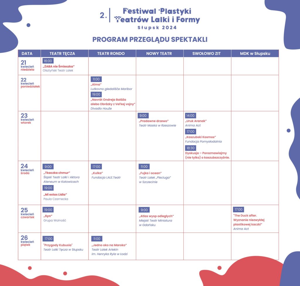 Po sukcesie pierwszego Festiwalu Plastyki Teatrów Lalki i Formy ponownie zapraszamy na tę wyjątkową imprezę. Tym razem zobaczymy aż 16 przedstawień, które widzowie oglądać będą na scenach Tęczy, Ronda, Nowego Teatru oraz w Zagrodzie Inicjatyw Twórczych w Swołowie. Do Słupska przyjadą twórcy teatru formy z Polski, Słowacji i Słowenii. Obejrzymy spektakle wybrane przez komisję kwalifikacyjną spośród kilkudziesięciu zgłoszonych na naszą imprezę.