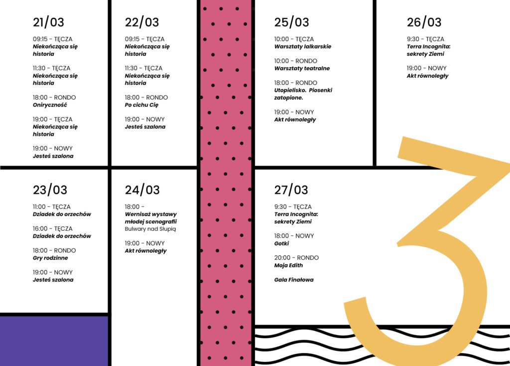 TRZY TEATRY w Słupsku to unikalne w naszym regionie wydarzenie, które – na przekór stereotypom – łączy w działaniu trzy miejskie sceny: Nowy Teatr, Teatr Lalki Tęczę i Teatr Rondo.