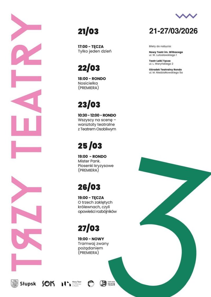 3 Teatry to unikalne w skali regionu wydarzenie, podczas którego Nowy Teatr im. Witkacego w Słupsku, Teatr Tęcza i Teatr Rondo, na przekór stereotypom, łączą siły, by pokazać mieszkańcom, że Słupsk Kulturą Stoi! Podczas siedmiu dni trwania naszego festiwalu proponujemy Państwu udział w 5 spektaklach, w tym aż trzech premierowych. Dodatkowo w tym roku przygotowaliśmy warsztaty teatralne z Teatrem Osobliwym, przygotowane dla uczniów klas I-III szkół podstawowych.