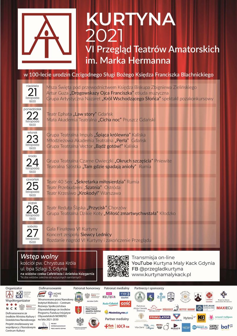 Kurtyna 2021 odbyła się dzięki dofinansowaniu z programu NOWEFIO Narodowego Instytutu Wolności oraz włączeniu się w organizację Narodowego Centrum Kultury, wsparciu finansowym Ministerstwa Kultury i Dziedzictwa Narodowego oraz Prezydenta Gdyni – Wojciecha Szczurka i wielu innych firm, instytucji oraz członków wspólnoty Ruch Światło-Życie, bez których Kurtyny by po prostu nie było.