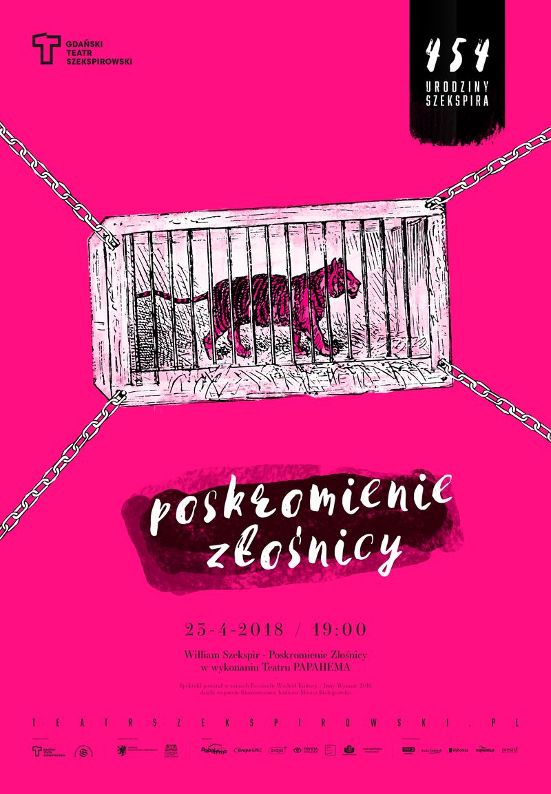 Gdański Teatr Szekspirowski zaprasza do wspólnego świętowania kolejnych, 454. Urodzin Williama Szekspira, tradycyjnie obchodzonych 23 kwietnia. Tym razem na jego deskach zagości spektakl „Poskromienie złośnicy” w wykonaniu Teatru PAPAHEMA, zdobywcy Nagrody Publiczności oraz Nagrody Gazety „Shakespeare Daily” w Konkursie SzekspirOFF podczas 21. Festiwalu Szekspirowskiego w Gdańsku.