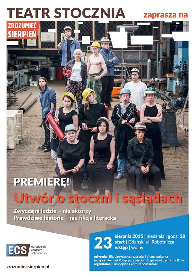 Teatr Stocznia realizowany jest w ramach projektu Zrozumieć Sierpień, obywatelskich obchodów Sierpnia ‘80., dzięki którym budujemy tożsamość, integrujemy lokalną społeczność, zachęcamy mieszkańców do wspólnych działań. Finał tegorocznej edycji Zrozumieć Sierpień zaplanowano na drugą połowę sierpnia . Trwają przygotowania do akcji w różnych częściach miasta, m.in. na Biskupiej Górce, Orunii, Stogach. Będą pikniki, gry edukacyjne, wykłady historyczne i akcje artystyczne. Wszystko wymyślone i przygotowane przez samych mieszkańców, przy współpracy z Europejskim Centrum Solidarności.