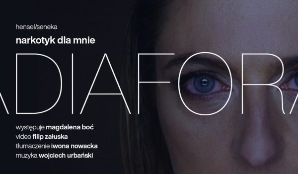 „Adiafora. Narkotyk dla mnie” to wariacja na temat tekstu Kaia Hansena, który wystawiany wielokrotnie na scenach europejskich nie miał dotąd polskiej premiery. Siłą dramatu jest jego egzystencjalny i krytyczny wymiar. Pani domu, żona i matka staje się figurą całego pokolenia zanurzonego w „płynnej nowoczesności”, której nurt nieustannie przyspiesza; a jej historia to studium nadwrażliwości, niespełnienia i samotności.“Wybrakowanym ludziom zawsze czegoś brakuje” – powtarza bohaterka. Co zrobić, jeśli metafizycznej tęsknoty nie można dłużej tłumić? Czym zapełnić pustkę, gdy pozór stał się naszym sposobem bycia w świecie? Jak sprostać rosnącym wymaganiom i pokonać lęk, który nieustannie narasta? Uzależnienie bohaterki to metafora przymusu, któremu w różnym stopniu podlega każdy z nas.Monolog podzielony jest na trzy głosy. Kobieta w żywym planie i dwie postaci w projekcjach, niczym ego, id i superego – materializują wewnętrzny konflikt bohaterki – rozszczepienie jej osobowości. Zakładniczka idealnego projektu samej siebie, zaprasza widzów do brutalnej wiwisekcji swojego życia i uzależnienia.PS. Adiafora – (gr. ἀδιάφορα) rzeczy obojętne, moralnie ani dobre, ani złe. W etyce stoickiej życie i śmierć, zdrowie i choroba, młodość i starość należą do kategorii rzeczy obojętnych. Dobro i zło bowiem wynika zawsze z wewnętrznego wyboru i nie jest determinowane okolicznościami zewnętrznymi. Ideał moralny jest możliwy, szczęście jest możliwe i zależy tylko od ciebie…