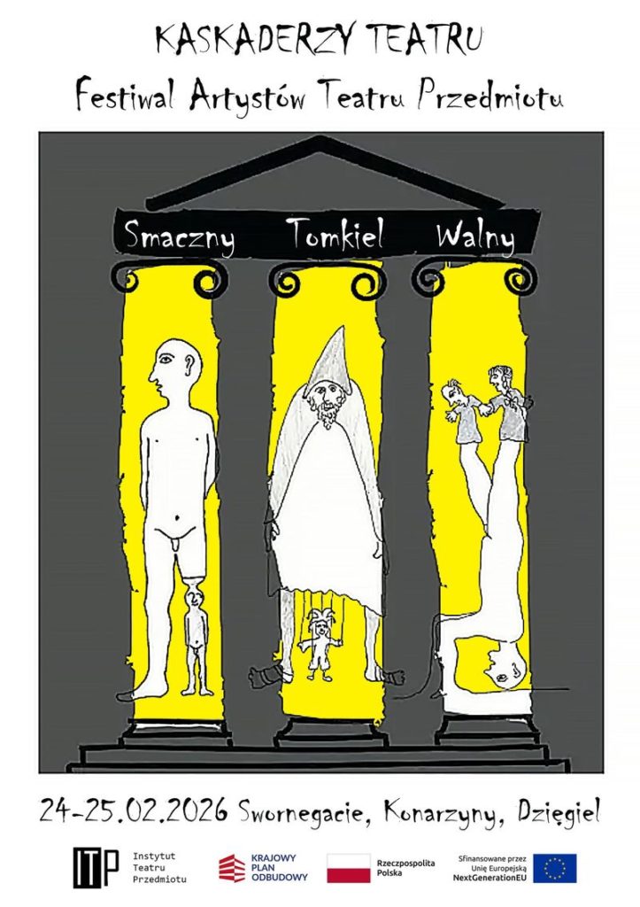 Instytut Teatru Przedmiotu oraz  Wiejski Dom Kultury w Swornegaciach i Biblioteka Ośrodek Kultury Konarzyny zapraszają na festiwal teatralny: Kaskaderzy Teatru. Walny. Smaczny. Tomkiel. Festiwal Artystów Teatru Przedmiotu.