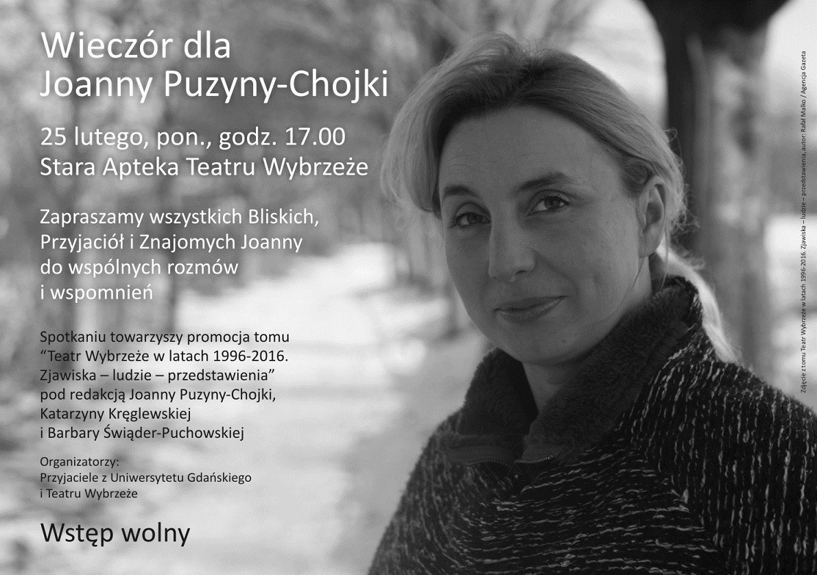 W poniedziałek, 25 lutego 2019 o godzinie 17.00 w Starej Aptece w Teatrze Wybrzeże odbędzie się wieczór poświęcony pamięci Joanny Puzyny-Chojki, wyjątkowej osobowości polskiego teatru – wybitnej gdańskiej teatrolożki, krytyczki, recenzentki, wykładowczyni Uniwersytetu Gdańskiego i animatorki życia teatralnego, która 28 czerwca 2018 roku zginęła w tragicznym wypadku na Bałkanach. Wieczorowi będzie towarzyszyć promocja tomu „Teatr Wybrzeże w latach 1996-2016. Zjawiska – ludzie – przedstawienia” pod redakcją Joanny Puzyny-Chojki, Katarzyny Kręglewskiej i Barbary Świąder-Puchowskiej, dedykowanego pamięci Puzyny-Chojki oraz drugiej wybitnej postaci polskiej i gdańskiej teatrologii, Jana Ciechowicza, który zmarł we wrześniu 2017 roku. Książka obejmuje zagadnienia, prezentujące okresy trzech dyrekcji gdańskiej sceny: Krzysztofa Nazara (1995 – 2000), Macieja Nowaka (2000 – 2006) i Adama Orzechowskiego (od 2006 roku). Autorzy tekstów zawartych w publikacji są teatrologami i krytykami teatralnymi, reprezentującymi różne ośrodki (przede wszystkim Uniwersytet Gdański), a także różne pokolenia oraz odmienne perspektywy badawcze. Tom, wydany przez Wydawnictwo Uniwersytetu Gdańskiego, dzięki wsparciu Miasta Gdańska, Rektora UG i Instytutu Filologii Polskiej UG, jest pokłosiem ogólnopolskiej konferencji naukowej Kreacje. Ostatnie dwudziestolecie Teatru Wybrzeże (1996-2016), która odbyła się w Gdańsku w dniach 14-15 października 2016 roku z okazji 70-lecia Teatru Wybrzeże. Jej organizatorami byli Teatr Wybrzeże oraz Katedra Dramatu, Teatru i Widowisk UG. Joanna Puzyna-Chojka odpowiadała za koncepcję konferencji, a Jan Ciechowicz sprawował nad nią opiekę naukową. Był to prawdopodobnie ich ostatni wspólny projekt, który właśnie się finalizuje.