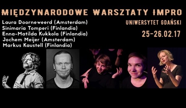 Teatr Improwizacji Uniwersytetu Gdańskiego, pod wodzą Małgorzaty Różalskiej i Akademickie Centrum Kultury mają przyjemność zaprosić Was, Drodzy Improwizatorzy, Widzowie, Studenci, na ekscytujący Weekend Międzynarodowych Warsztatów Impro. Na zaproszenie Róży, do Polski przyjadą doświadczeni trenerzy impro z Holandii i Finlandii, którzy uczą i występują na całym świecie. Spośród szerokiego wachlarza ich warsztatów Róża skomponowała zestaw, który potrąci wiele strun z naszego instrumentu zwanego Impro i pozwoli zagrać akordy, które mogą być dla nas odkrywcze, trudne, spektakularne, dzikie, ale i poetyckie, szczere i naturalne. Będziecie mieli szansę wejść w świat Quentina Tarantino, impro dla dzieci, żonglowania stylami impro, poetyckiego impro rodem z północy, śpiewania bez obaw i używania ciała i przestrzeni na scenie, a nie tylko własnej głowy.