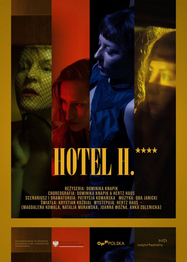 Miejscem akcji spektaklu jest hotel – (nie-)miejsce prowizoryczne, ulotne, oraz podatne na przestępstwa. W tę tajemniczą przestrzeń autorki wpisują konwencję kryminału, przewrotnej analizie poddając motyw kobiety-ofiary. „Hotel H.****” to przedstawienie inspirowane m.in. kinem Alfreda Hitchcocka, malarstwem Edwarda Hoppera oraz twórczością Petera Handke. Twórczynie podejmują w nim dialog z niesławnym, wizualnym dziedzictwem male gaze, które uprzedmiotawia, seksualizuje lub/i wykorzystuje kobiety jako narzędzie dla budowania przewagi męskich postaci. W efekcie ciało kobiety ukazane przez męskie spojrzenie znaczy dla oglądających więcej niż faktyczne działania, cele i perypetie bohaterek. W spektaklu “Hotelu H.****” autorki podejmują ten temat z poczuciem humoru, bawiąc się formą i nieustanną dekonstrukcją. Widz prowadzony z pokoju do pokoju przegląda się w metamorfozach nieskończonych ról, realizowanych przez cztery performerki: detektywki, zamordowane, oprawczynie…