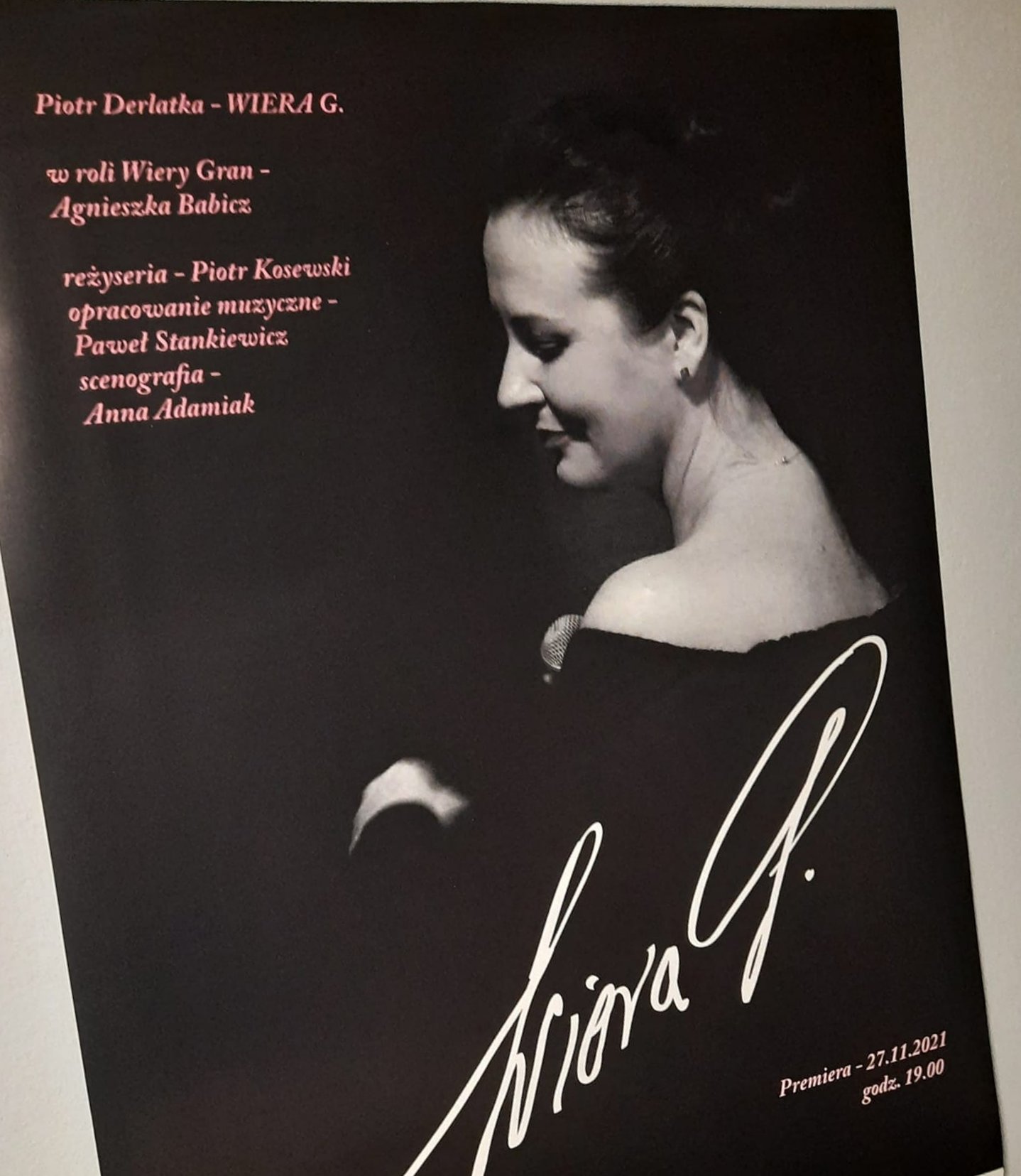 Wiera G. to monodram napisany przez Piotra Derlatkę dla trójmiejskiej aktorki Agnieszki Babicz. Oparty jest na biografii i piosenkach z repertuaru Wiery Gran, wielkiej zapomnianej już artystki, polskiej pieśniarki żydowskiego pochodzenia. Wiera Gran była aktorką kabaretową i filmową, która podczas wojny śpiewała w getcie warszawskim, a po wojnie była prześladowana oskarżeniami o kolaborację z Niemcami stając się ofiarą ówczesnego hejtu. Młoda artystka matowym kontraltem wykonywała w warszawskich kabaretach piosenki o miłości. Do wybuchu wojny nagrała ich 60 na 28 płytach. Od wiosny 1942 r. była artystyczną sensacją kawiarni Sztuka w warszawskim getcie. Przeżyła okupację jako jedyna z rodziny. Do końca życia odpierała zarzuty, że wyjście z getta okupiła kolaboracją z gestapo. Mimo oświadczeń i wygranych procesów wciąż spotykała się ostracyzmem ludzi dających wiarę oskarżeniom. Bardzo chciała oczyszczenia się z pomówień – m.in. dlatego napisała książkę “Sztafeta oszczerców: Autobiografia śpiewaczki”.