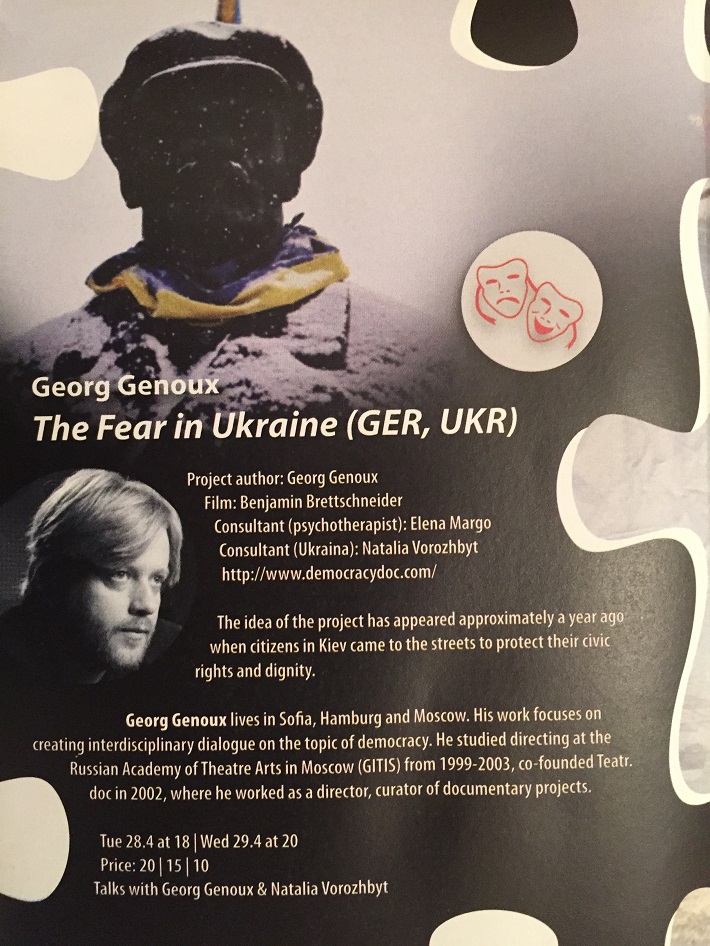 „Fear in Ukraine” to interdyscyplinarny projekt Georga Genoux będący częścią większej myśli pt. „Democracy.com”. Przedstawia sytuację współczesnej Ukrainy, m.in. niedawne wydarzenia na Majdanie, opowiedzianą przez osoby będące bezpośrednimi świadkami wydarzeń i żyjące na co dzień w tej trudnej rzeczywistości. Historie mieszkańców przekazane są widzom w postaci videoinstalacji, na którą składa się film Benjamina Brettschneidera oraz wywiady przeprowadzone przez autora projektu w obecności psychoterapeuty, w czasie jego kilkunastu wizyt u naszych wschodnich sąsiadów. „Fear in Ukraine“ ma na celu pokazanie prawdziwej strony sytuacji na Ukrainie słowami zwykłych ludzi, a nie w sposób, jaki robiły to i robią media komercyjne.