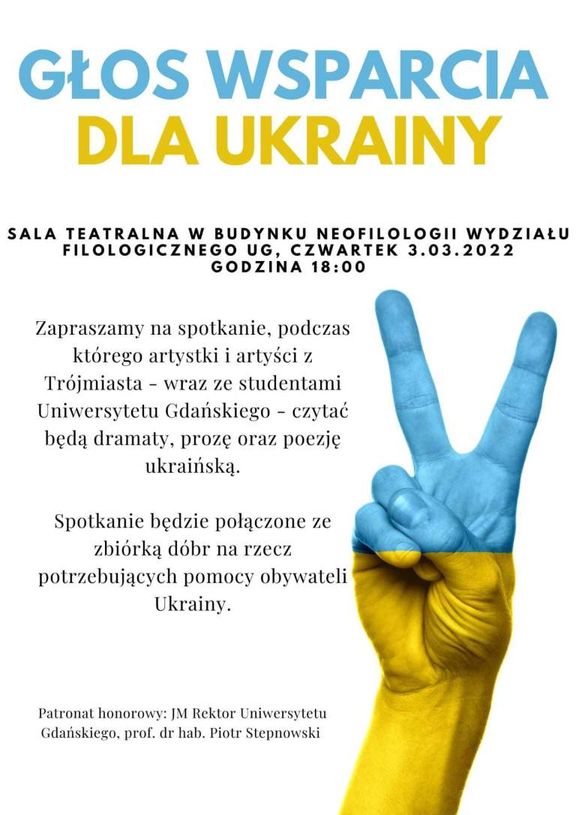 My, studenci i społeczność akademicka Uniwersytetu Gdańskiego, wspierani przez artystki i artystów związanych z trójmiejską sceną teatralną, pragniemy wyrazić nasz sprzeciw, oddając głos tym, którzy powinni być dziś najbardziej słyszalni. Chcemy oddać głos nie tylko ukraińskim twórcom, ale też ludziom, w których imieniu się wypowiadają: chcemy oddać głos „zwykłym” obywatelom Ukrainy, naszym sąsiadom i przyjaciołom, którzy zostali zmuszeni do opuszczenia swojej ojczyzny. Dedykujemy to spotkanie nie tylko wszystkim osobom, które dziś bohatersko walczą w obronie swojego kraju, ale także tym, które ogarnia niemoc, strach i rozpacz.