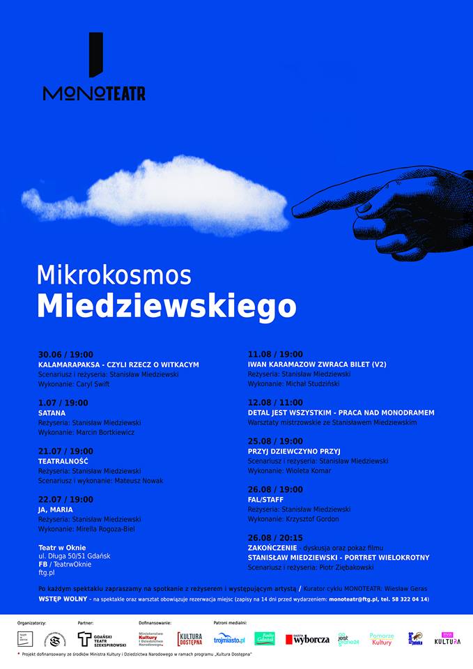 Zapraszamy na przegląd spektakli jednego aktora, wybranych z grona najlepszych tytułów jakie powstały pod reżyserską ręką Stanisława Miedziewskiego. Do udziału w projekcie zaprosiliśmy wyśmienitych przedstawicieli sceny monodramu: Mateusza Nowaka, Wioletę Komar, Caryl Swift, Marcina Bortkiewicza, Alberta Osika, Monikę Dąbrowską, Mirellę Rogozę-Biel i Michała Studzińskiego. Spektaklom każdorazowo towarzyszyć będą rozmowy z ich twórcami. Drugim komponentem projektu jest warsztat mistrzowski ze Stanisławem Miedziewskim, skierowany do osób posiadających podstawowe doświadczenie reżyserskie lub aktorskie nabyte w teatrach amatorskich. Na zakończenie zapraszamy na dyskusję z udziałem ekspertów oraz na film „Stanisław Miedziewski – Portret wielokrotny” w reżyserii Piotra Ziębakowskiego, ukazujący różnorodne refleksje osób współpracujących z reżyserem.