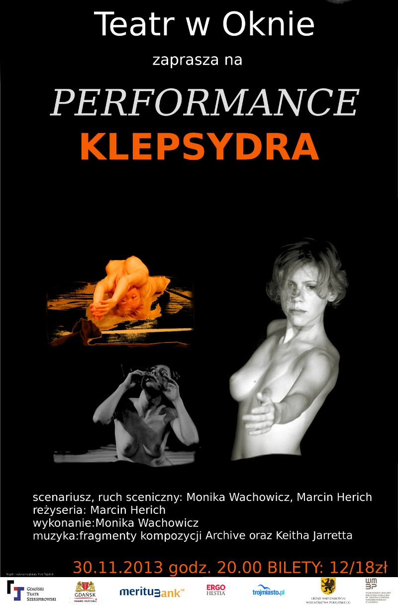 Autorzy o spektaklu: „Klepsydra” to kameralny projekt sceniczny, zbiór etiud teatralnych z pogranicza wizualnego teatru ciała, gestu i emocji oraz teatru tańca. Spektakl powstał w wyniku współpracy aktorki Moniki Wachowicz i reżysera Marcina Hericha. Tytuł przedstawienia, a także jego koncepcja sceniczna i zarysowana w nim opowieść odnoszą się do dwoistości znaczenia słowa „klepsydra” oznaczającego z jednej strony zegar piaskowy będący metaforą nieuchronnie upływającego życia, jak również ogłoszenie żałobne. Przedstawienie jest swoistym rytuałem żałobnym, ostatnim spotkaniem, tęsknotą, w którym Eros i Thanatos nierozerwalnie splatają się w jedno. W spektaklu można odnaleźć odniesienia do twórczości Milana Kundery i Krzysztofa Kieślowskiego.