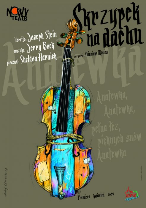 Słynny musical według libretta Josepha Steina opartego o powieść tworzącego w jidysz galicyjskiego pisarza Szolema Alejchema – „Tewie mleczarz”. Istotą tego barwnego widowiska muzycznego (i tanecznego) jest afirmacja człowieczeństwa, ukazanego na tle codziennego życia małej społeczności żydowskiej zasiedlającej niewielką mieścinę Anatewka na zachodniej Ukrainie na początku XII wieku – życia, którego rytm wyznacza rygorystyczna żydowska tradycja, rozmywana co i rusz przez ogarniające ówczesną carską Rosje wrzenie rewolucyjne i zmiany obyczajowe, których powiew dotyka również tę małą, zamkniętą społeczność. Któż dziś nie zna słynnej, a przecież niemal „sztandarowej” piosenki tego musicalu: „Gdybym był bogaty” – niejako emanacji marzeń ubogiego mleczarza ale i jednocześnie na pewien sposób filozofa – Tewiego, ojca pięciu córek, borykającego się z codziennymi problemami, a jednak pogodnego, wciąż dyskutującego z Bogiem na temat losu swojego, swoich najbliższych i bliźnich. Warstwę muzyczną „Skrzypka na dachu” stworzył Jerry Bock, a teksty piosenek – Sheldon Harnick.
