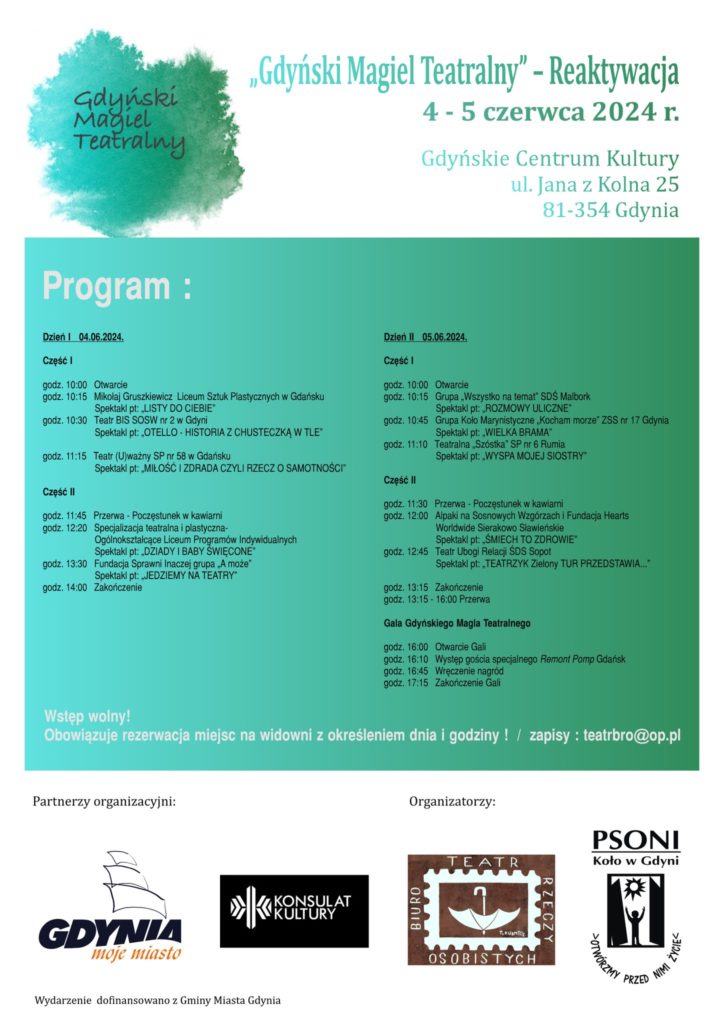Do udziału zapraszamy grupy teatralne ze szkół podstawowych i ponadpodstawowych oraz zespoły skupiające osoby z niepełnosprawnością. Prezentacje oceniane będą przez Jury Gdyńskiego Magla Teatralnego. Werdykt poznamy podczas Gali Finałowej GMT. Przewidziano również występ gościa specjalnego.