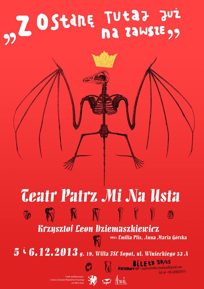 Willa FSC jedyne alternatywne (oprócz Sfinksa). miejsce w Sopocie, gdzie artysta i sztuka stoją w kolejce przed gastronomią. Współpracuję z Willą ob początku jej funkcjonowania i wybór tego miejsca na premierę był w pełni świadomy.Jest tu mocno ograniczona przestrzeń sceniczna i mała widownia ale atutem jest bliski kontakt występujących z widzem i możliwość nawiązania bezpośredniego kontaktu. Trudno cokolwiek ukryć. Jest mi jak zwykle bardzo trudno pisać o tym, co robię, emocje i cały przekaz mojego działania koncentruję w spektaklu. Pierwszy raz w mojej twórczości odnoszę się do sytuacji politycznej w najbliżej otaczającej mnie rzeczywistości. Dlatego też tytuł pierwotny brzmiał ” Chory kraj”. Mimo wszystko i tak najbardziej interesuje mnie w mojej pracy człowiek, jego emocjonalność, rozterki, działanie w desperacji, kontakt z otaczającymi go ludżmi i z otaczającą Go rzeczywistością. Żeby przybliżyć Tobie ideę ” ZOSTANĘ TUTAJ JUŻ NA ZAWSZE” posłużę sie dwoma cytatami. Pierwszy jest fragmentem felietonu Grzegorz Welizarowicz o pracy mojego teatru. Drugi to cytat z książki ” Jedyna rewolucja” J. Krishnamurtiego.Z obydwoma identyfikuję się w 100%.