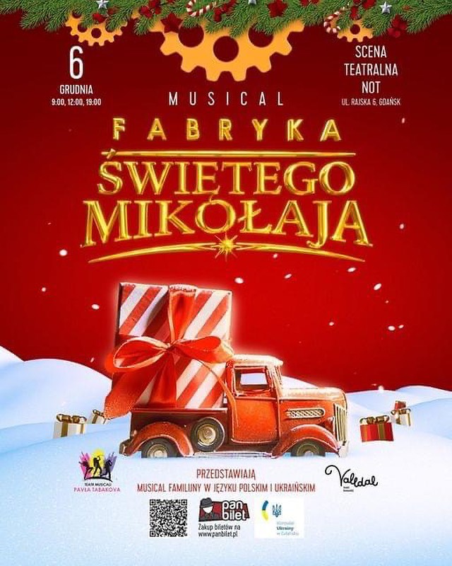 Teatr Musicali Pavlo Tabakowa ze Lwowa we współpracy z naszym Teatrem, przy ogromnym wsparciu Konsulatu Ukrainy w Gdańsku serdecznie zaprasza na familijny musical „Fabryka Świętego Mikołaja”. W ubiegłych latach musical ten zrobił furorę w Ukrainie rozgrzewając serca i emocje widzów. Tym razem zagrają zarówno po polsku, jak i ukraińsku, a wszystko po to, aby wykorzystać i połączyć talenty dzieci ukraińskich i polskich, przedstawić wspólne wartości naszych narodów i umocnić przyjaźń między Ukrainą a Polską. W tych okrutnych czasach, któż to zrobi lepiej, jak nie dzieci?