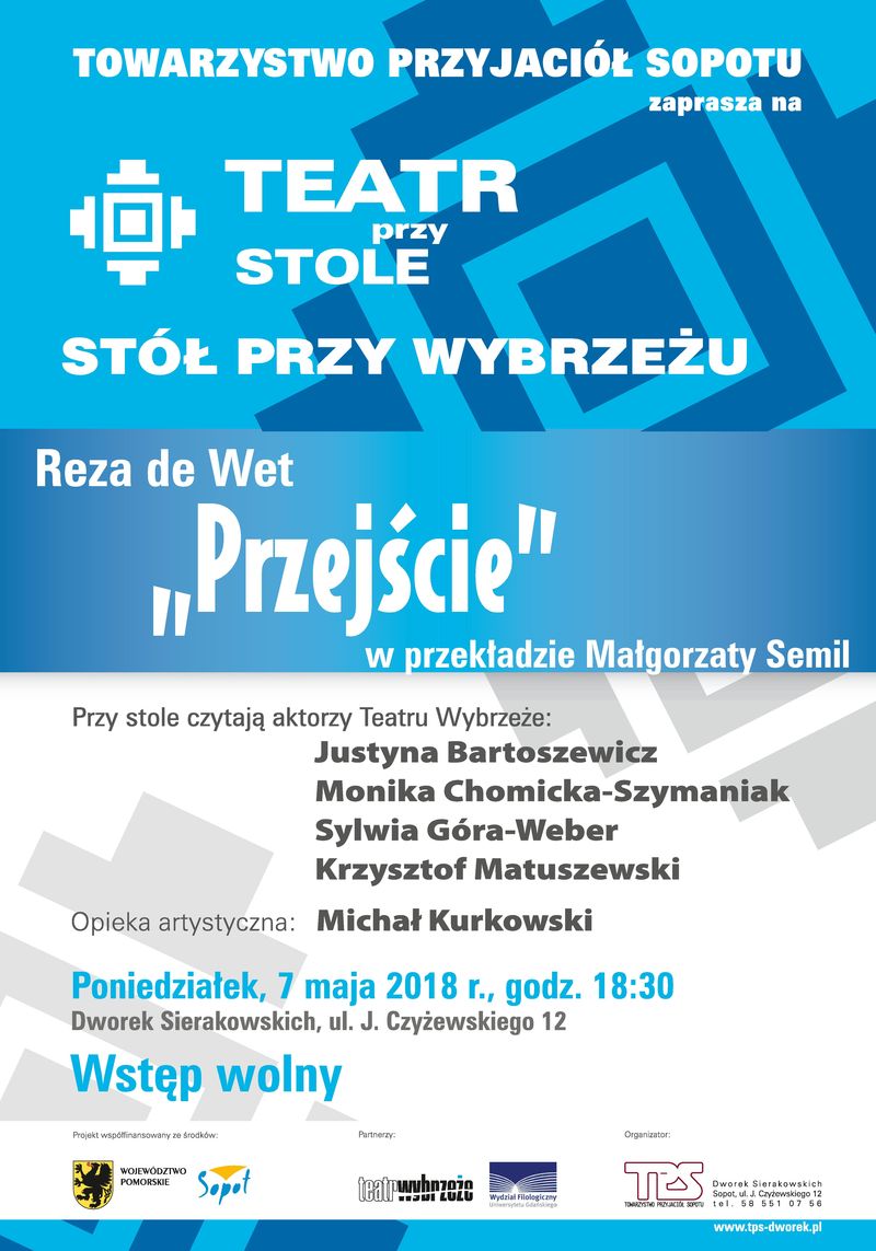 Na spotkaniu zostanie odczytana sztuka dramatopisarki pochodzącej z RPA Rezy de Wet, pt. PRZEJŚCIE w przekładzie Małgorzaty Semil. W czytaniu wezmą udział aktorzy Teatru Wybrzeże: Justyna Bartoszewicz, Monika Chomicka–Szymaniak, Sylwia Góra–Weber i Krzysztof Matuszewski. Opiekę artystyczną będzie sprawował Michał Kurkowski, natomiast wygłoszeniem słowa wstępnego oraz poprowadzeniem dyskusji po czytaniu zajmie się słuchaczka Filologicznych Studiów Doktoranckich Uniwersytetu Gdańskiego – Alicja Szemberska. Wstęp wolny. Zapraszamy!