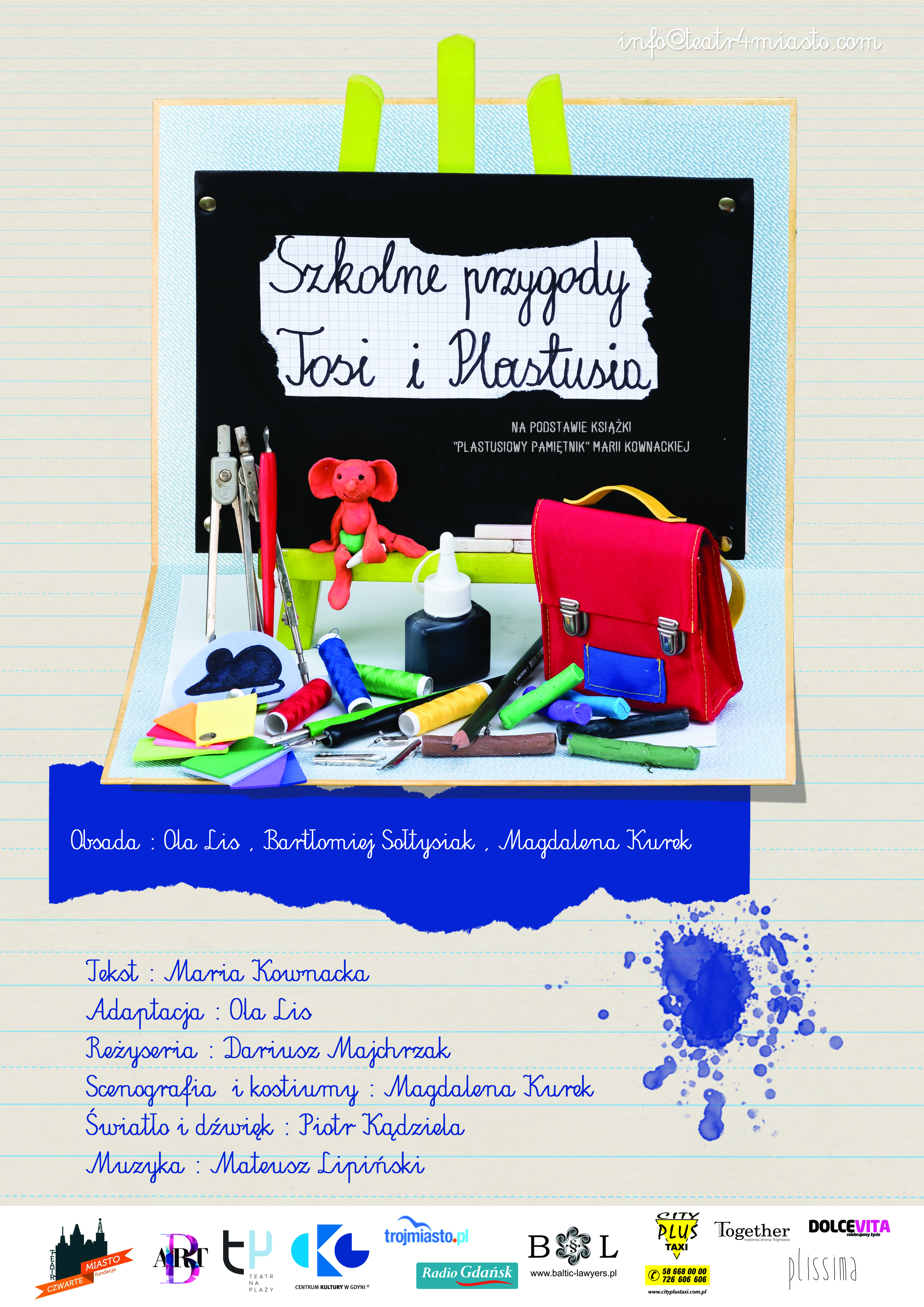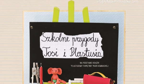 „Szkolne przygody Tosi i Plastusia” to spektakl teatralny dla najmłodszych, ale i starszym zakręci się w oku łezka na widok sympatycznego ludzika, którego pamiętają ze swych dziecięcych lat. Na scenie pojawią się oczywiście Tosia i Plastuś, a także przybory z piórnika, w którym Plastuś przecież mieszkał i z którego lokatorami się przyjaźnił. Będzie również straszny Kałamarz, z którym Plastuś stoczy pojedynek, Pan od Rachunków (uwaga! może niespodzianie wyrwać do odpowiedzi, więc lepiej powtórzyć tabliczkę mnożenia), czy niegrzeczny Witek. Wyjątkowo z Plastusiem będzie można pośpiewać, bo adaptacja wzbogacona jest o autorskie piosenki. Tak więc niektórzy raz jeszcze, a inni po raz pierwszy będą mogli zobaczyć jak wyglądało szkolne życie, kiedy nasze babcie nosiły fartuszki i używały do pisania stalówek.