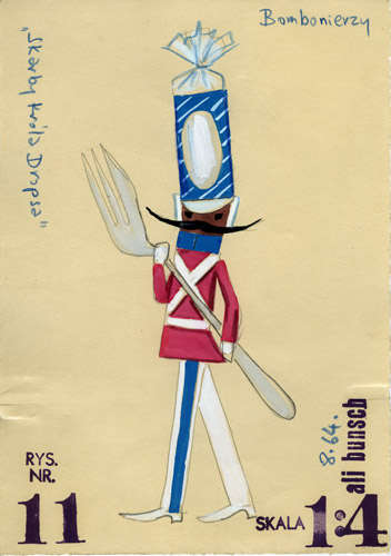 Ali Bunsch, projekty lalek do Skarbów Króla Dropsa Marii Skwarnickiej,reż. zespołowa, Teatr Miniatura, Gdańsk, 1965.
