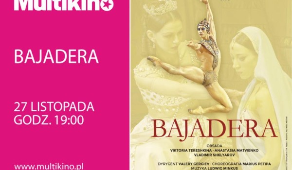 27 listopada Multikino zaprasza na wyjątkowe wydarzenie. Widzowie w 13 Multikinach w Polsce będą mieli okazję po raz pierwszy zobaczyć retransmisję baletu w 3 aktach „Bajadera”. Nagranie zrealizowana w 2013 roku w Teatrze Maryjskim w Petersburgu. Widzowie po raz pierwszy zobaczą retransmisję tego wyjątkowego wydarzenia na wielkim ekranie.