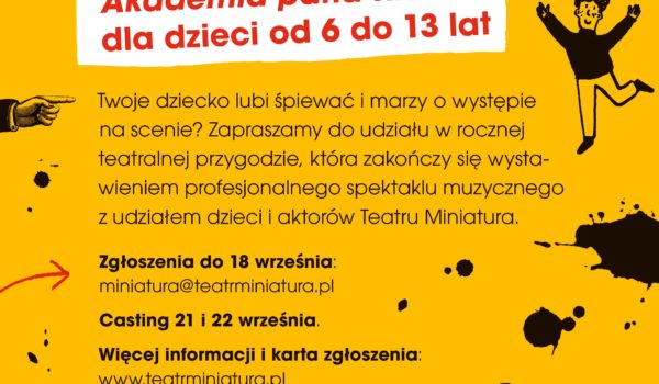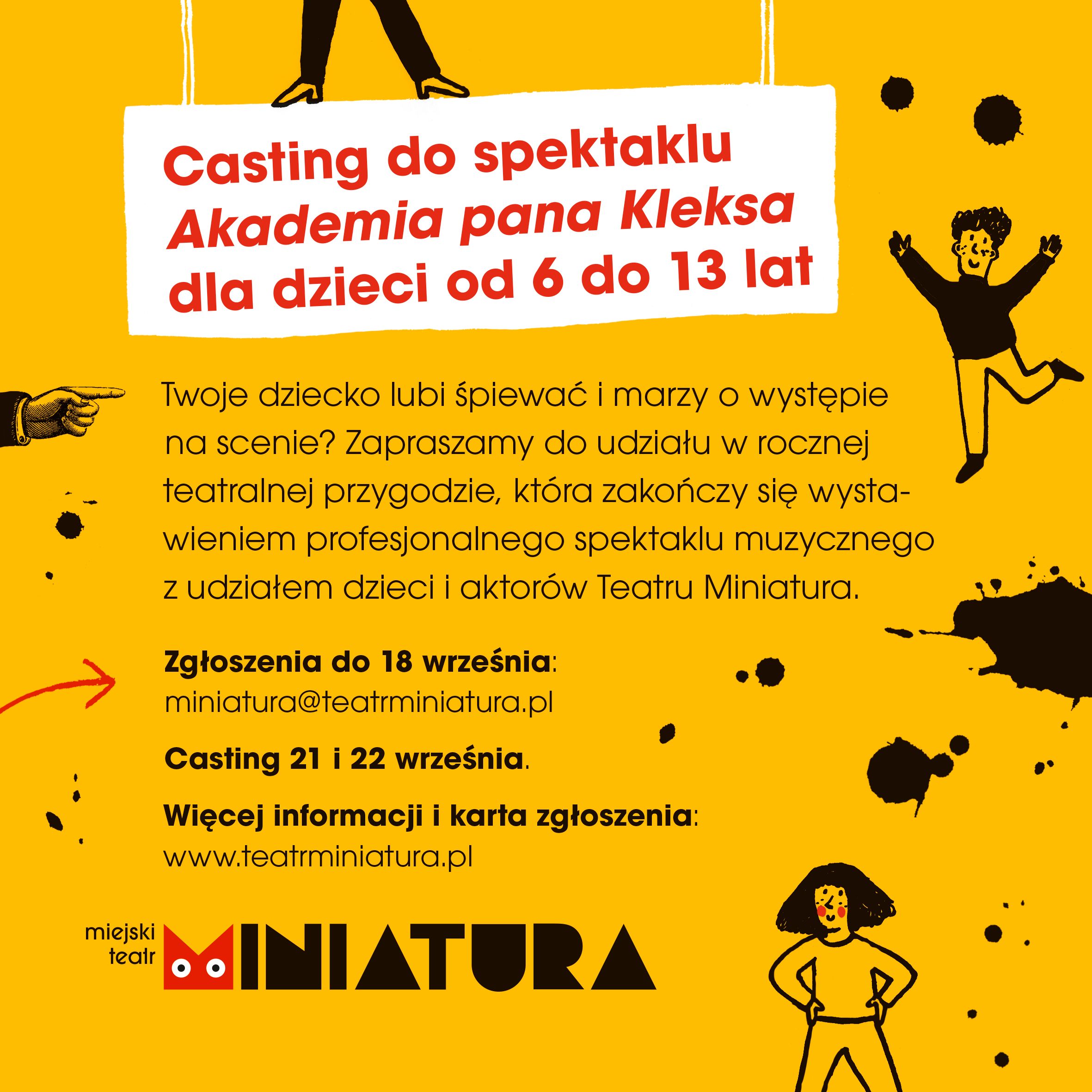 Na Dzień Dziecka w przyszłym roku odbędzie się premiera „Akademii pana Kleksa” – muzycznego spektaklu familijnego z udziałem dzieci i aktorów Teatru Miniatura, który będzie prezentowany na Dużej Scenie. Przygotowania zaczną się już w tym roku – 21 i 22 września dzieci w wieku od 6 do 13 lat chcące wziąć udział w przedstawieniu Miniatura zaprasza na casting, a raczej – jak mówi reżyserka projektu, Agnieszka Płoszajska – antycasting, bo nie trzeba być wystylizowanym i poprawnym, liczą się umiejętność współpracy, otwartość i wyobraźnia. Agnieszka Płoszajska jest aktorką i reżyserką, która wraz z mężem, dramatopisarzem Emilem Płoszajskim, specjalizuje się w realizacji muzycznych spektakli familijnych.