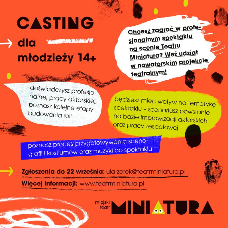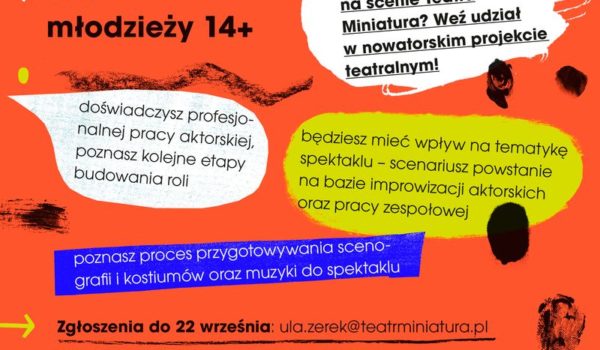 25 września o 17.00 w Teatrze Miniatura odbędzie się casting dla młodzieży od 14 lat, która podczas kilkumiesięcznej pracy przygotuje profesjonalny spektakl teatralny we współpracy z reżyserami Dorotą Bielską i Jarosławem Rebelińskim oraz scenografem i kompozytorem. Doświadczy profesjonalnej pracy aktorskiej, pozna kolejne etapy budowania roli. Będzie miała wpływ na tematykę spektaklu, ponieważ scenariusz powstanie na bazie improwizacji aktorskich oraz pracy zespołowej. Pozna proces przygotowywania scenografii i kostiumów oraz muzyki do spektaklu. Dorota Bielska jest reżyserką, absolwentką PWST w Krakowie, i teatrolożką, która realizuje spektakle dla dzieci i dorosłych w teatrach i instytucjach kultury.