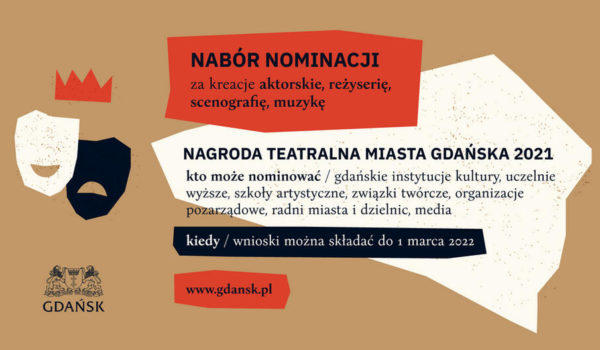 Do 1 marca można zgłaszać kandydatów do 15. edycji Nagrody Teatralnej Miasta Gdańska. Nagroda zostanie przyznana trzem twórcom najciekawszych kreacji teatralnych 2021 roku. Można nominować twórców w siedmiu kategoriach: reżyseria, rola męska, rola żeńska, scenografia, muzyka, debiut roku lub za całokształt dorobku artystycznego.