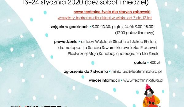 Warsztaty poprowadzą aktorzy Miniatury Wojciech Stachura i Jakub Ehrlich, dramatopisarka Sandra Szwarc, choreografka Ula Zerek i kierowniczka Pracowni Plastycznej Maja Kanabaj. Z przyniesionych przez uczestników starych zabawek powstaną teatralne lalki, które zagrają wraz z dziećmi w finałowym spektaklu 24 stycznia o 17.00 na Dużej Scenie Teatru Miniatura. Zgłoszenia są przyjmowane do 7 stycznia na adres miniatura@teatrminiatura.pl – należy przesłać wypełnioną kartę zgłoszenia, którą można pobrać na stronie teatru.