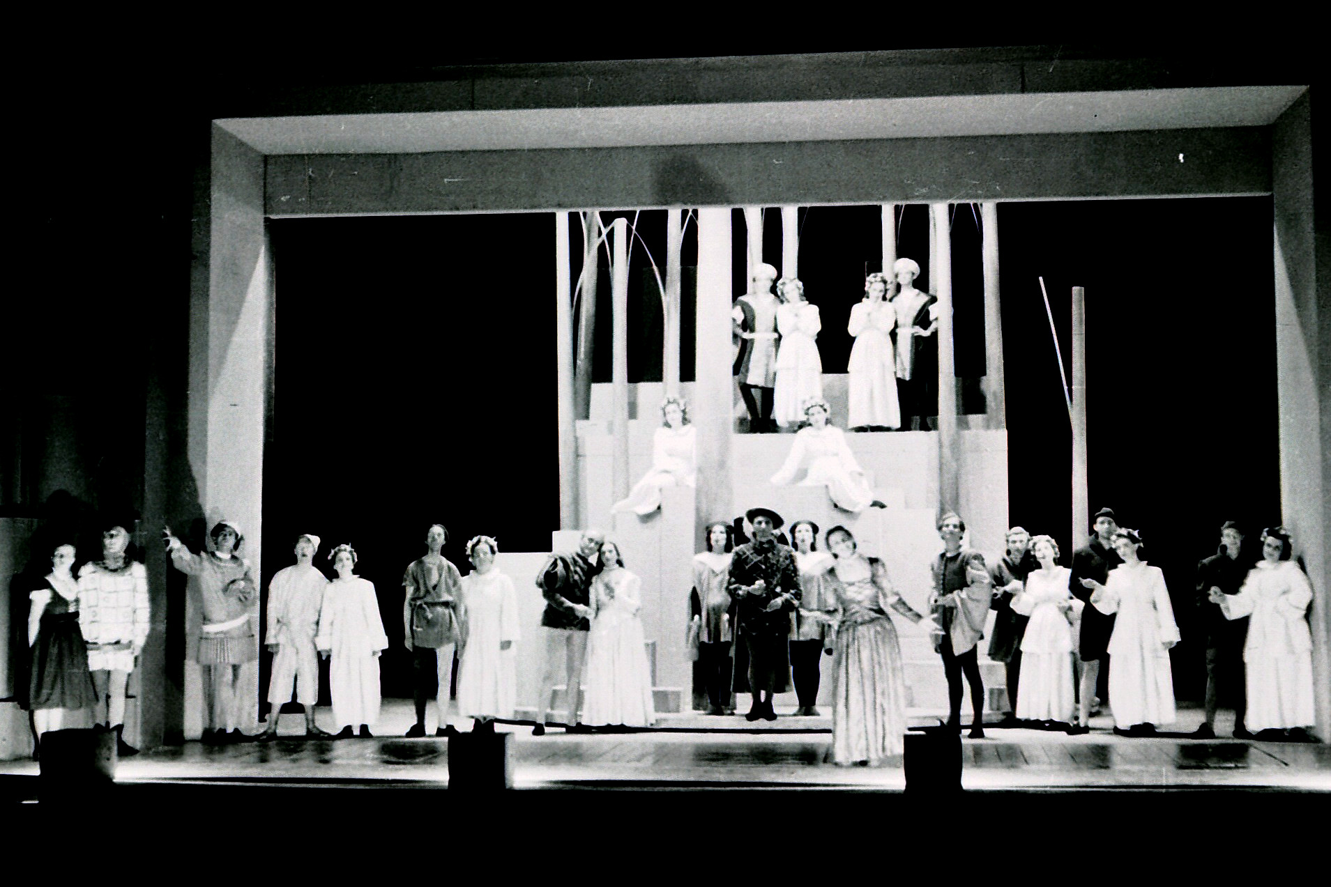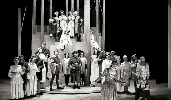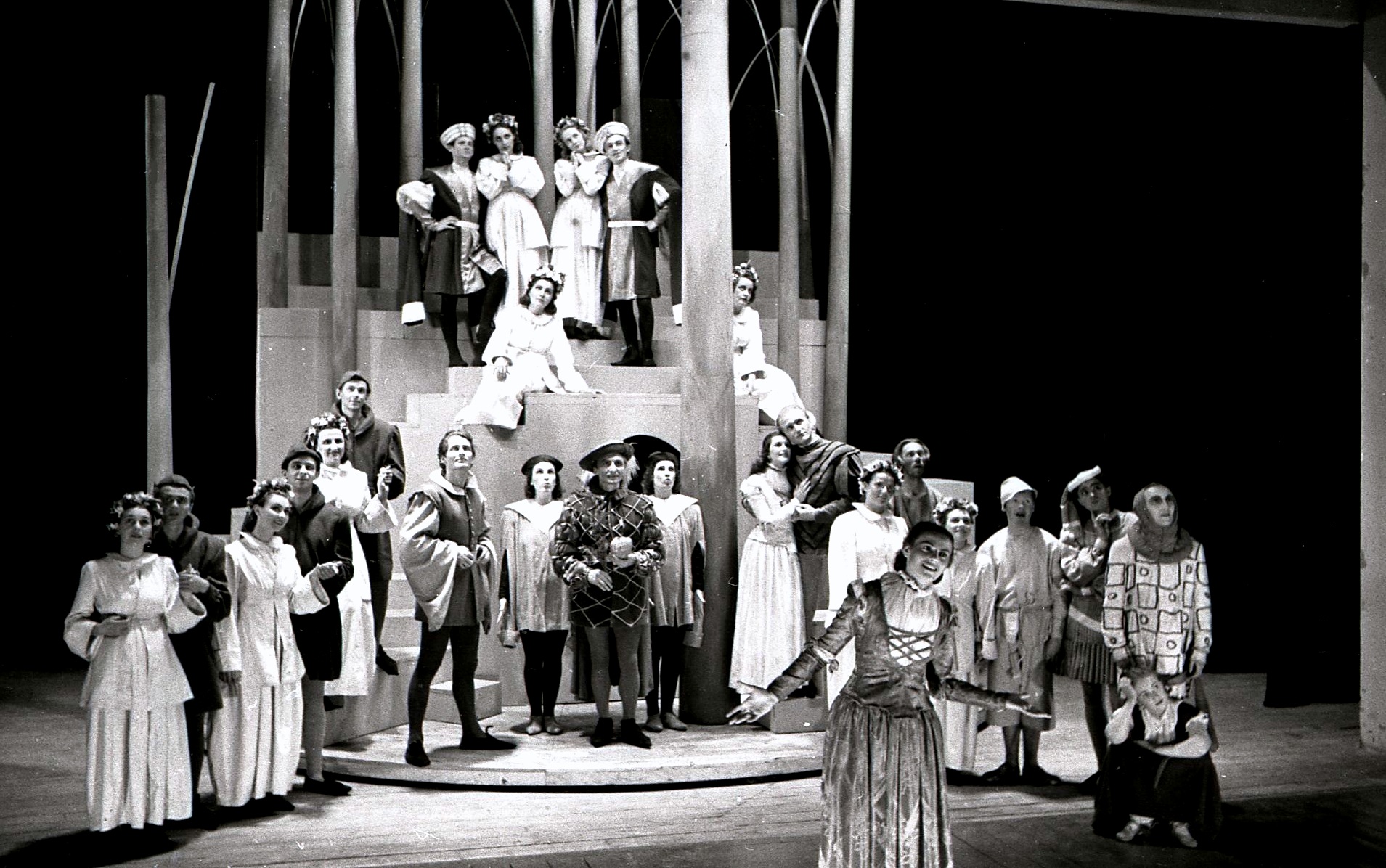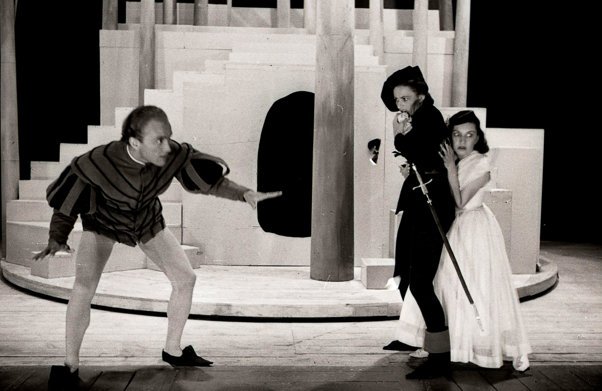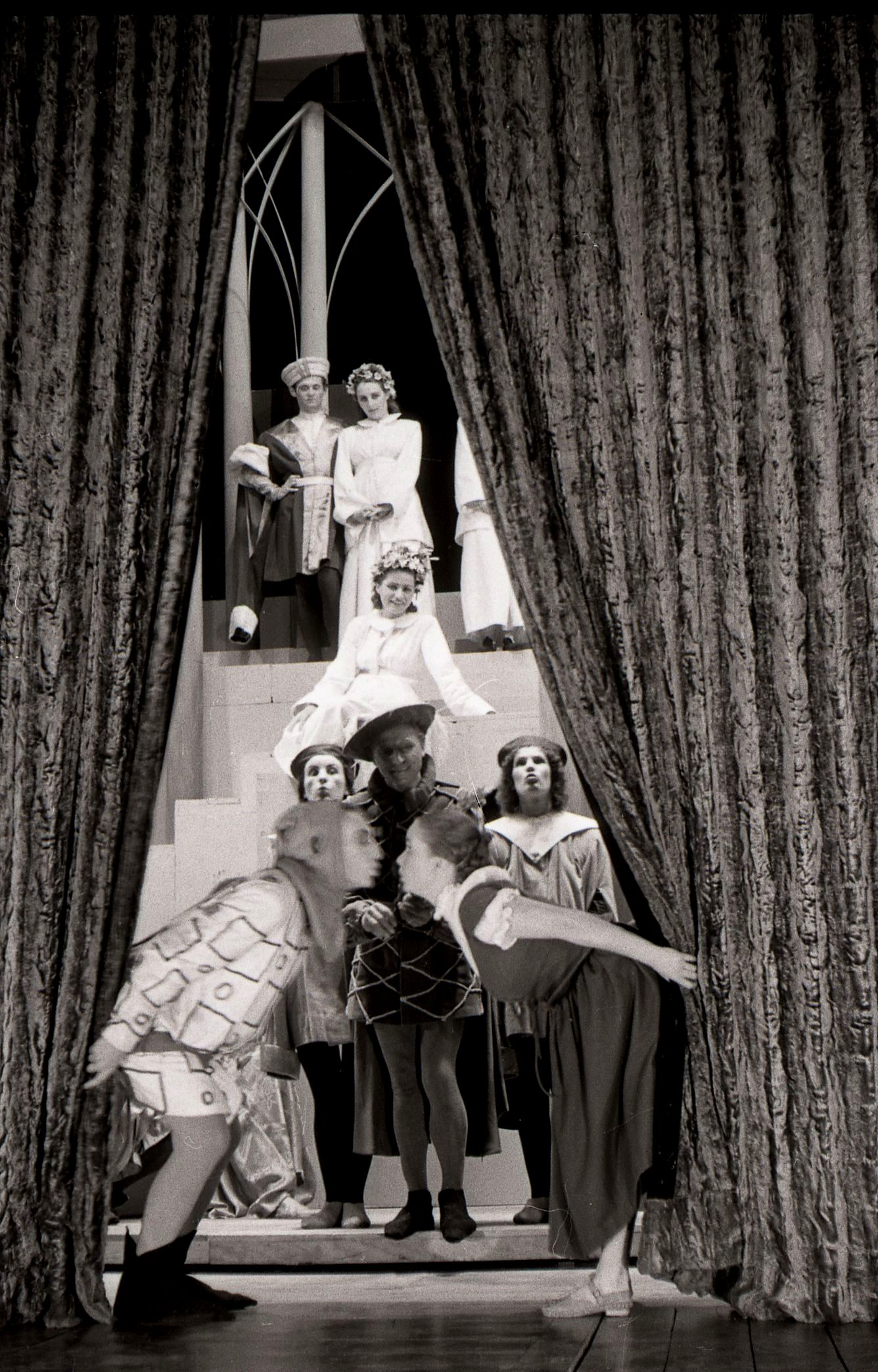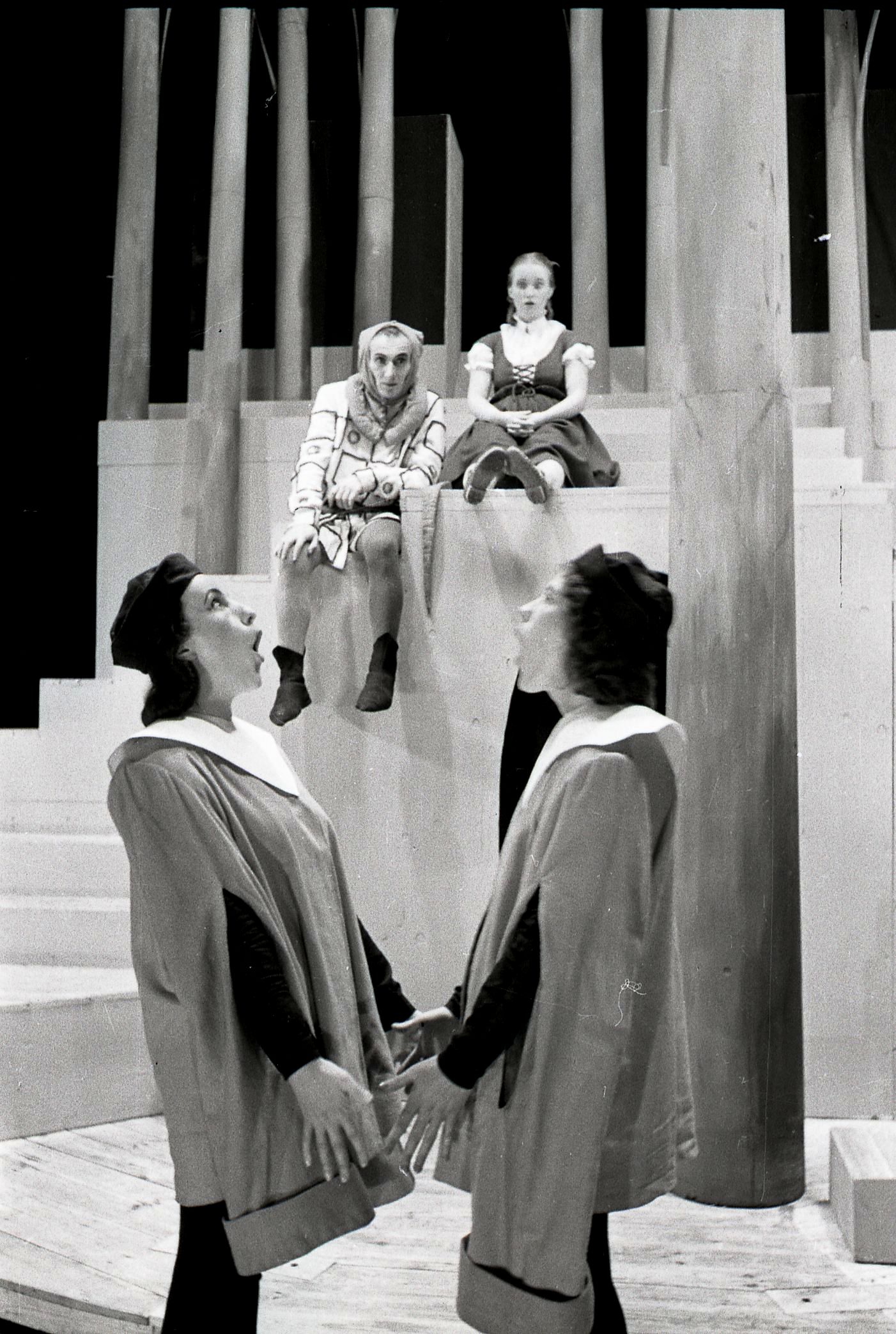 Na zdjęciu:Barbara Krafftówna (Kasia), Włodzimierz Kwaskowski (Próbka), Ewa Krasiejko (Paź I), Magdalena Byszewska (Paź II) – zdjęcie ze spektaklu Jak wam się podoba Wiliama Szekspira, insc. i reż. Iwo Gall, Teatr „Wybrzeże” Gdynia, prem. 13 V 1947; fot. Edmund Zdanowski.