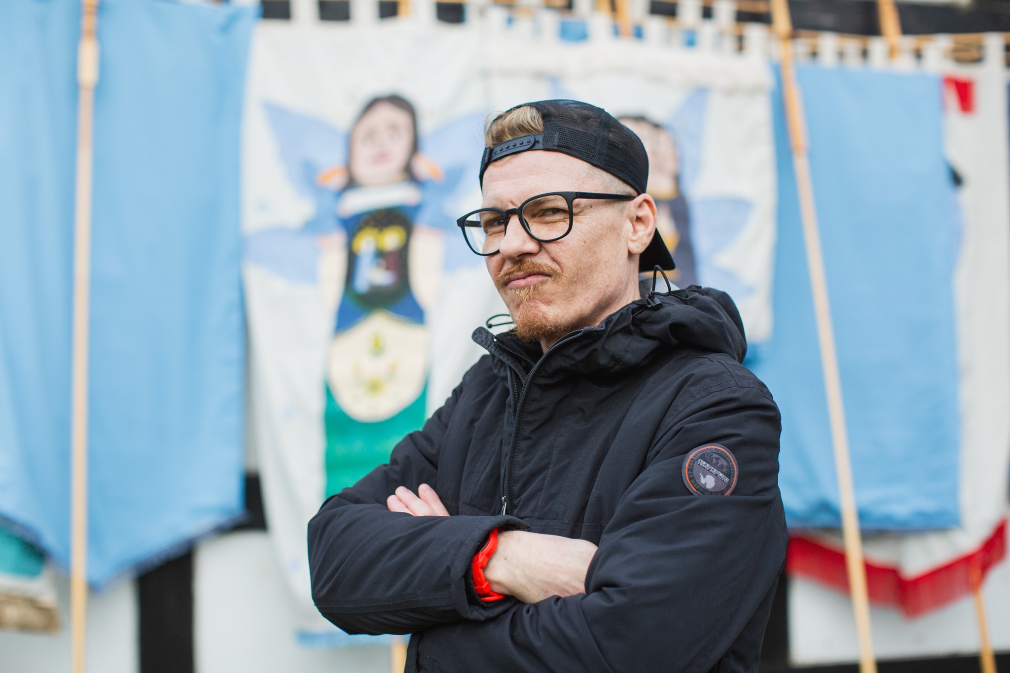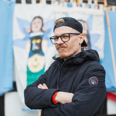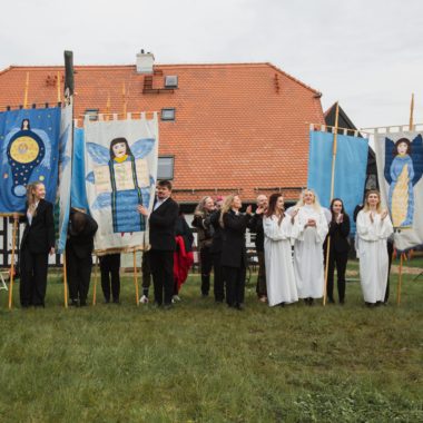 Sztandary, projekt plakatu, elementy scenografii: Karol Formela