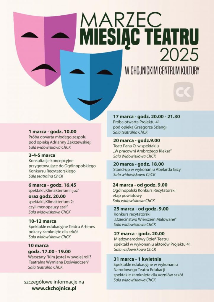 Chojnickie Centrum Kultury zaprasza do wspólnego obchodzenia Miesiąca Teatru – Marca. Tak jak w latach poprzednich (poza innymi wydarzeniami) ten miesiąc dedykowany jest teatrowi.