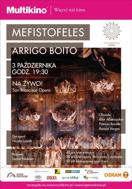 Transmisja opery „Mefistofeles” odbędzie się 3 października o 19:30 w 10 kinach sieci Multikino: Gdańsk, Gdynia, Kraków, Łódź (Silver Screen), Poznań Stary Browar, Rzeszów, Szczecin, Warszawa Ursynów, Wrocław Arkady Wrocławskie oraz Zabrze.
